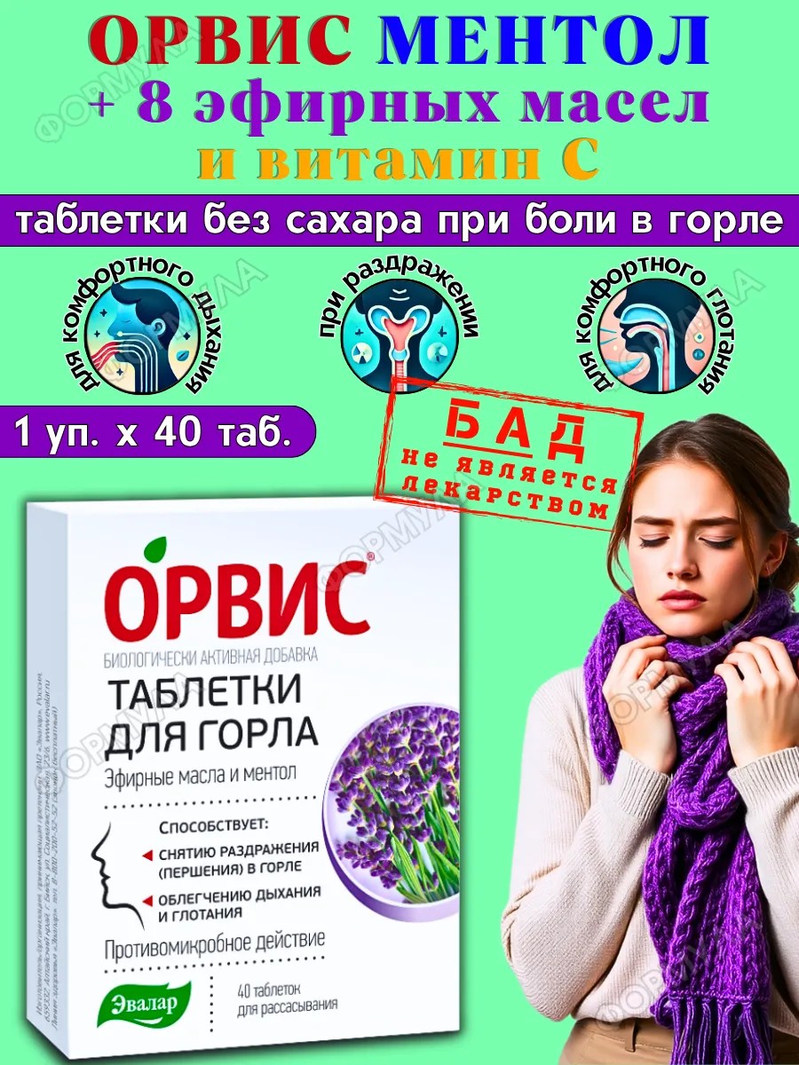 Эвалар Орвис Эфирые масла и ментол таблетки для горла 40таб*1уп