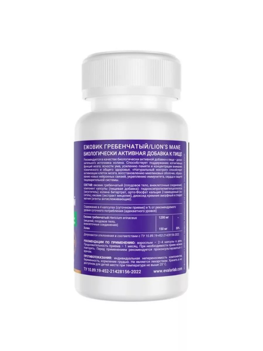 Ежовик гребенчатый 300 мг от Evalar Laboratory -это уникальный органический препарат, содержащий полный спектр грибов из мицелл, плодовых тел и внеклеточных соединений. Состав усилен холином - метаболическим предшественником важного нейромедиатора ацетилхолина.Способствует:поддержанию когнитивных функций мозга, работая как натуральный «ноотроп»: ясности ума, усилению памяти и концентрации внимания,активизации клеток мозга, восстановлению миелиновых оболочек, образованию новых нейронных связей, поддержке психического и общего здоровья,укреплению иммунитета и сердца,защите пищеварительной системы.Дозировка 300 мг в 1 капсуле. Способ примененияВзрослым -2-4 капсулы в день. Продолжительность приема -1 месяц. При необходимости прием можно повторять.Составежовик гребенчатый порошок, оболочка капсулы (загуститель -гидроксипропилметилцеллюлоза или желатин), холина битартрат, носитель -орто-Фосфат кальция 2-замещенный, экстракт мицелия ежовика гребенчатого, агенты антислеживающие: магниевая соль стеариновой кислоты, диоксид кремния аморфный.