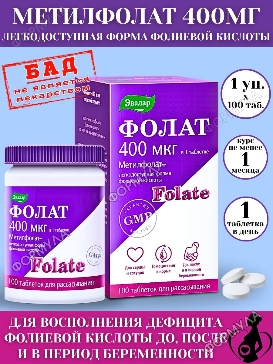 Фолат 400 мкг от Эвалар — это удобство, качество и уверенность в том, что ваш организм получает всё необходимое для полноценной работы. Биологически активная добавка, не является лекарственным средством.