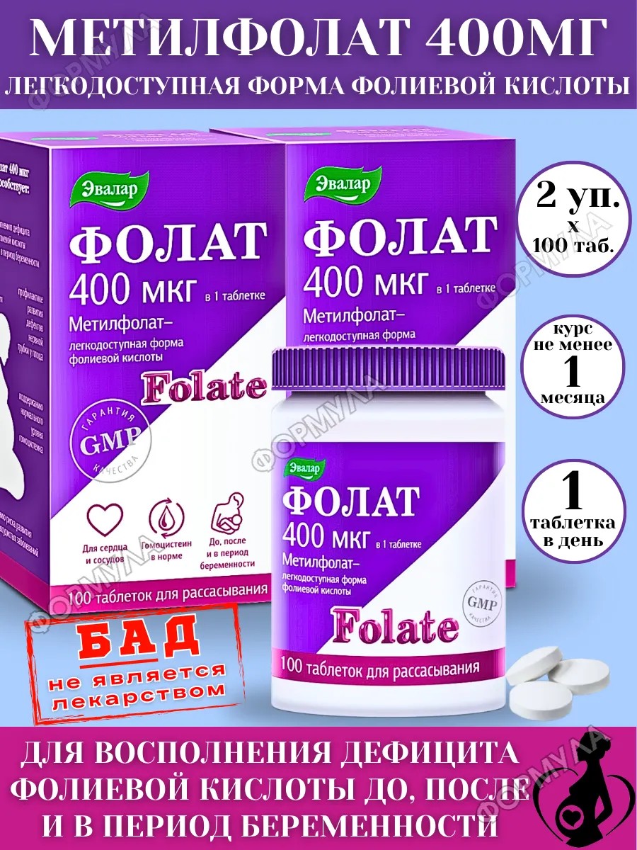 Фолат 400 мкг от Эвалар — это удобство, качество и уверенность в том, что ваш организм получает всё необходимое для полноценной работы. Биологически активная добавка, не является лекарственным средством.