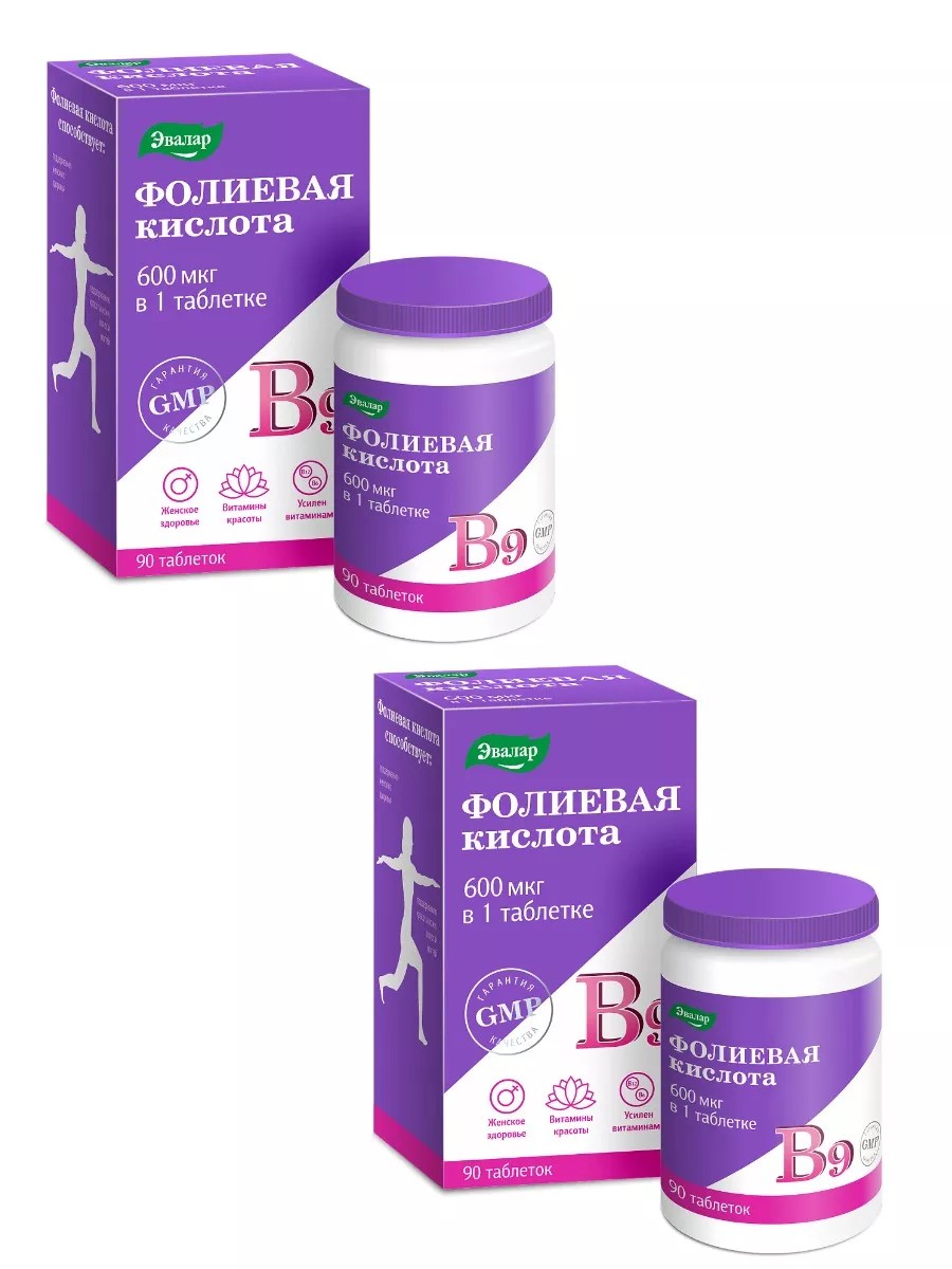 Эвалар Фолиевая кислота 600 мкг с витаминами В12 и В6 90шт 2уп