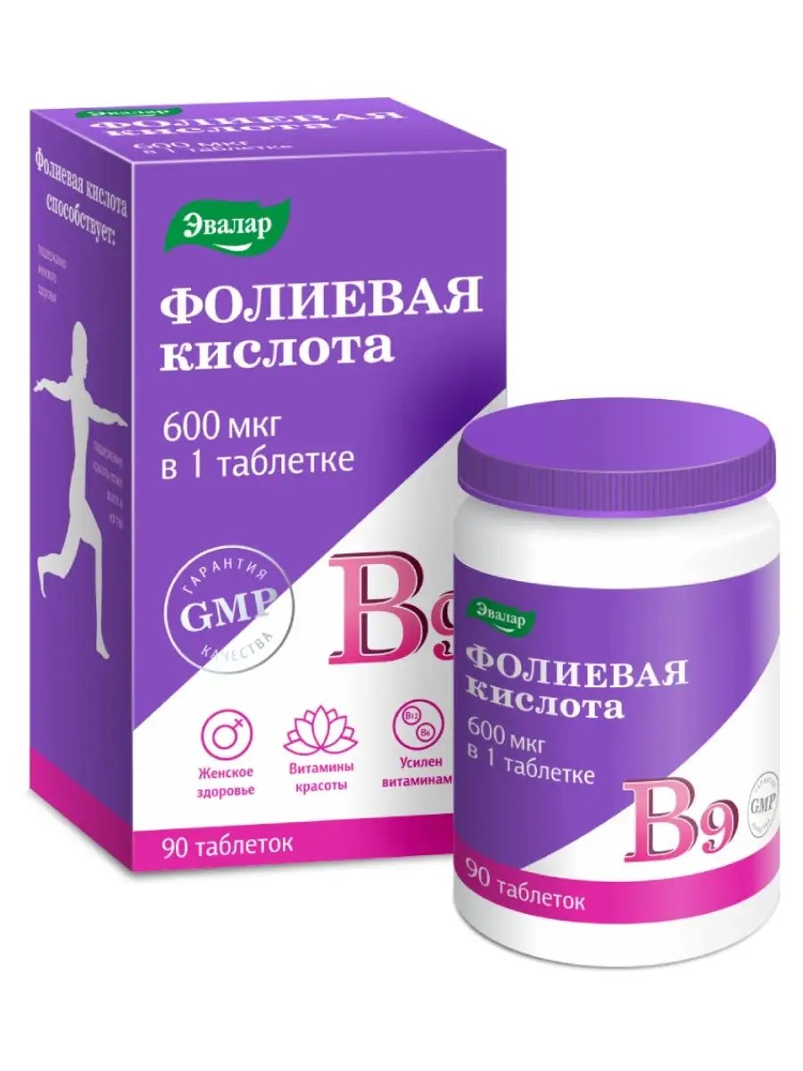 Эвалар Фолиевая кислота 600мг+витамины В12 и В6, таблетки 90шт