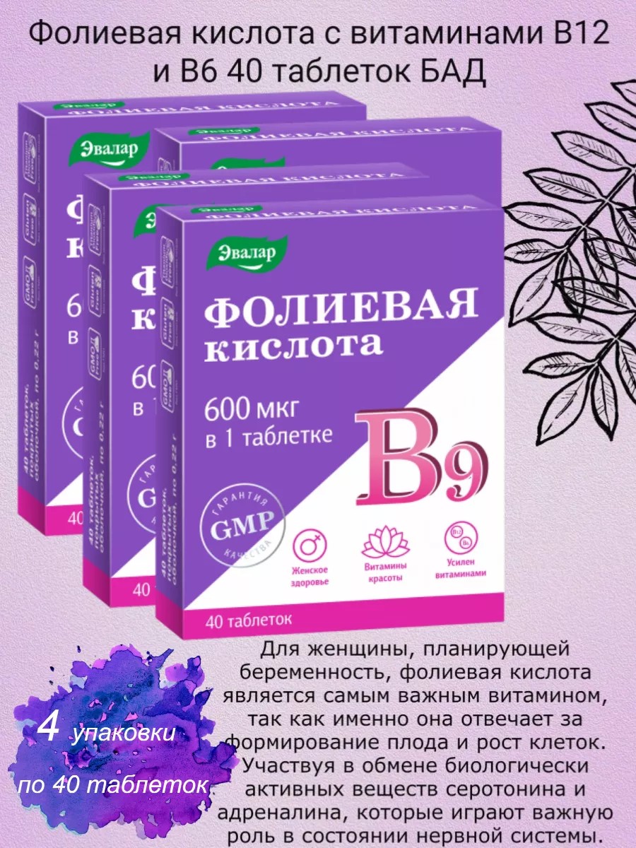 Фолиевая кислота с витаминами В12 и В6 40 таблеток БАД. Фолиевая кислота является фактором роста – она необходима организму для производства клеток кожи, слизистых, волос. Для женщины, планирующей беременность, фолиевая кислота является самым важным витамином, так как именно она отвечает за формирование плода и рост клеток. На ранних этапах беременности даже кратковременный дефицит фолиевой кислоты чреват развитием дефектов нервной системы у плода. Помимо участия в создании клеток плода, фолиевая кислота принимает участие в образовании всех форменных элементов крови. Кроме того, она обеспечивает хорошее настроение, участвуя в обмене биологически активных веществ серотонина и адреналина, которые играют важную роль в состоянии нервной системы. Витамин В12 и фолиевая кислота являются взаимосвязанными витаминами, поэтому рекомендуется их совместный прием. Недостаток витамина В12 приводит к развитию частичной или вторичной недостаточности фолиевой кислоты. Витамин В6 участвует в превращениях аминокислот, метаболизме триптофана, липидов и нуклеиновых кислот, участвует в поддержании иммунного ответа, в процессах торможения и возбуждения в центральной нервной системе, способствует нормальному формированию эритроцитов. Способствует поддержанию нормального уровня гомоцистеина в крови. Недостаточное потребление витамина В6 сопровождается повышенной утомляемостью, депрессивным состоянием, нервозностью, ухудшением состояния кожи. СПОСОБ ПРИМЕНЕНИЯ И ДОЗЫ: Принимать взрослым по 1 таблетке в день во время еды. Продолжительность приема 4-6 недель. При необходимости прием можно продолжить. Беременным и кормящим женщинам принимать под контролем врача.