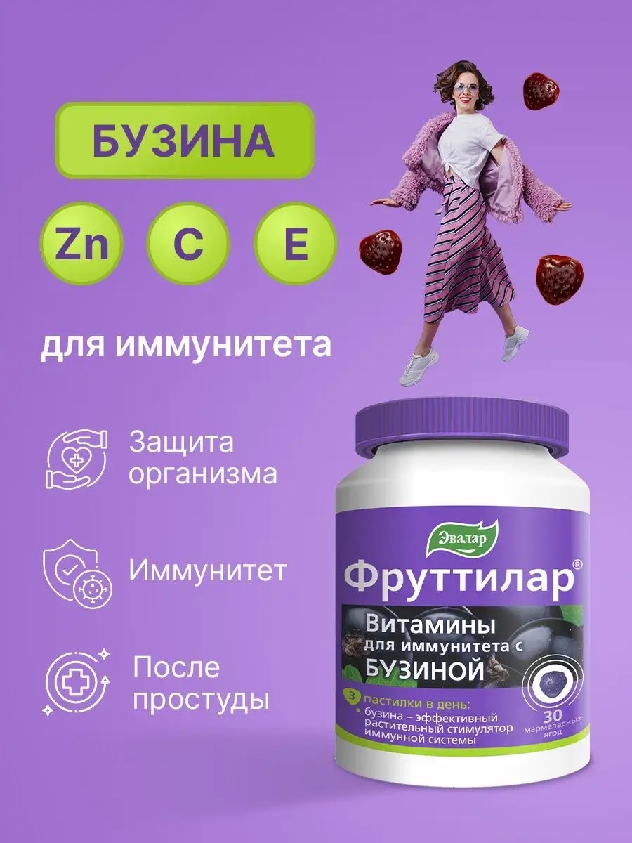 Уникальная форма витаминов - жевательные пастилки в форме мармеладных ягод. Первый комплекс для укрепления иммунитета с экстрактом бузины - эффективным растительным стимулятором иммунной системы.Фруттилар витамины для иммунитета способствуют:Повышению защитных сил организма, поддержанию активности иммунной системыСнижению риска развития простудных заболеваний, восстановлению после простуды (гриппа).