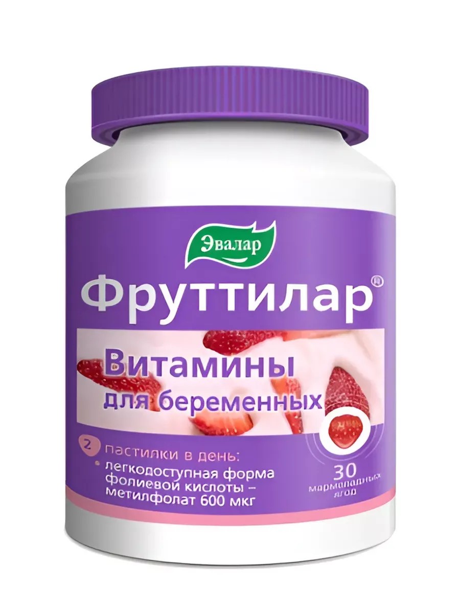 Фруттилар витамины для беременных Фолиевая кислота + L-метилфолат кальция + Витамины, минералы, йод и холинРацион беременных женщин недостаточно сбалансирован витаминами, минералами и другими полезными веществами. Поэтому в этот период женщины нуждаются в дополнительном приеме биологически активных веществ.Свойства витаминов и минераловФолаты необходимы для снижения риска возникновения врожденных пороков плода, включая дефекты нервной трубки головного и спинного мозга. В составе содержатся в двух формах: фолиевой кислоты и L-метилфолата кальция (EXTRAFOLATE) - высокоактивная легкодоступная форма.Йод - снижает опасность йододефицита как матери, так и для плода.Холин оказывает благотворное влияние на развитие плода и плаценты, а также на правильное функционирование печени матери.Витамин С - водорастворимый антиоксидант, способный нейтрализовать свободные радикалы. Играет важную роль в сопротивляемости организма инфекциям, позволяет снизить риск преждевременного отслоения плаценты и преждевременного отхождения вод при родах.Витамин D необходим для предупреждения рахита и нормализации метаболизма кальция.Витамин А необходим для нормального развития плода, снижению риска развития врожденных дефектов.Витамин Е - антиоксидант, защищает организм от вредного воздействия свободных радикалов.Витамины группы В необходимы для синтеза АТФ. Снижают развитие судорожного синдрома, уменьшают тревожные состояния, повышают секрецию молока. Играют большую роль в процессе овуляции и снижению риска возникновения выкидышей на ранней стадии беременности, а также снижают риск рождения ребенка с врожденными пороками сердца.Биотин способствует улучшению состояния кожи, ногтей и волос.Марганец необходим для формирования костной ткани и хрящей.Цинк влияет на рост плода и новорожденных, снижает риск осложнений во время родов.Пищевая ценность 1 пастилки: белки - 0,3 г, жиры - 0 г, углеводы - 2,6 г; энергетическая ценность (калорийность) - 46 кДж (11 ккал).Содержание в 2 пастилках (суточный прием)Витамин С 100 мгНиацин 19 мгВитамин Е 15 мгПантотеновая кислота 10 мгВитамин В6 2,6 мгВитамин В1 1,6 мгВитамин А 1080 мкгФолат 600 мкгв т.ч.фолиевая кислота 300 мкгL-метилфолат кальция 678 мкг (эквивалентно 300 мкг фолиевой кислоты)Биотин 150 мкгВитамин D 15 мкгВитамин В12 4 мкгХолин 10 мгЦинк 7,5 мгМарганец 1 мгЙод 150 мкг