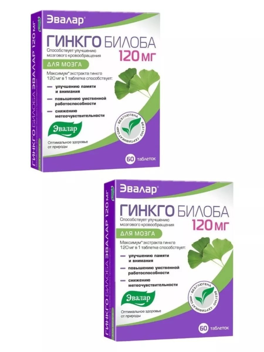 Ginkgo biloba Evalar 120 mg film-coated tablets weighing 0.5 g are a dietary supplement for improving memory and attention, enhancing mental performance, reducing weather sensitivity, improving cerebral circulation, and supplying brain cells with oxygen and nutrients. Each tablet contains 120 mg of ginkgo biloba extract and glycine. Adults are recommended to take 1 tablet daily with meals. Duration of use is at least 3 months. It is recommended to repeat the course twice a year. Consult a doctor before use. This product is not a medicine and does not replace a balanced diet.