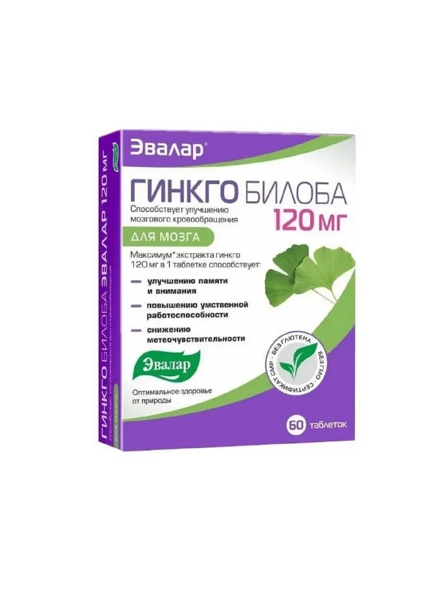 Ginkgo biloba Evalar 120 mg film-coated tablets weighing 0.5 g are a dietary supplement for improving memory and attention, enhancing mental performance, reducing weather sensitivity, improving cerebral circulation, and supplying brain cells with oxygen and nutrients. Each tablet contains 120 mg of ginkgo biloba extract and glycine. Adults are recommended to take 1 tablet daily with meals. Duration of use is at least 3 months. It is recommended to repeat the course twice a year. Consult a doctor before use. This product is not a medicine and does not replace a balanced diet.