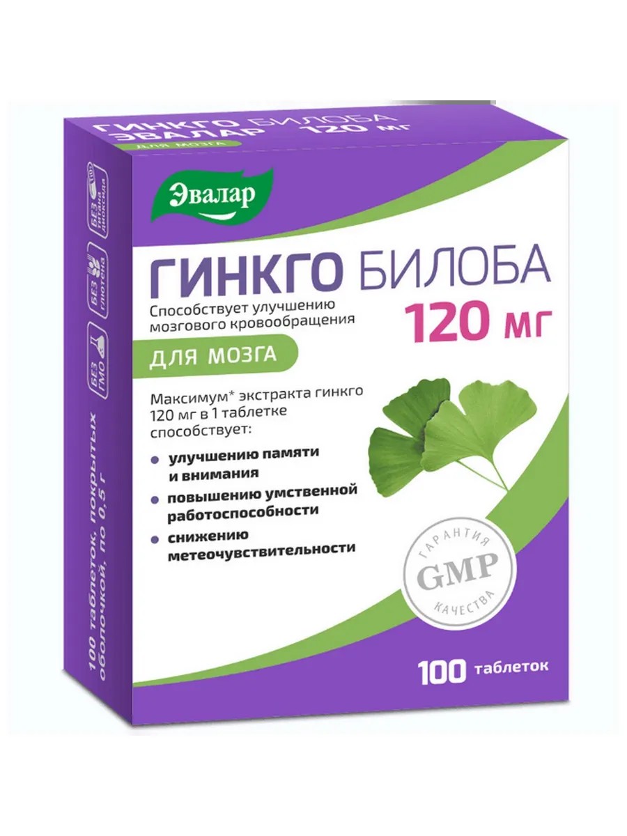 Ginkgo Biloba Evalar 120 mg helps to: - improve memory and attention; - increasing mental performance; - reducing sensitivity to weather; - improving cerebral circulation; - supplying brain cells with oxygen and nutrients.