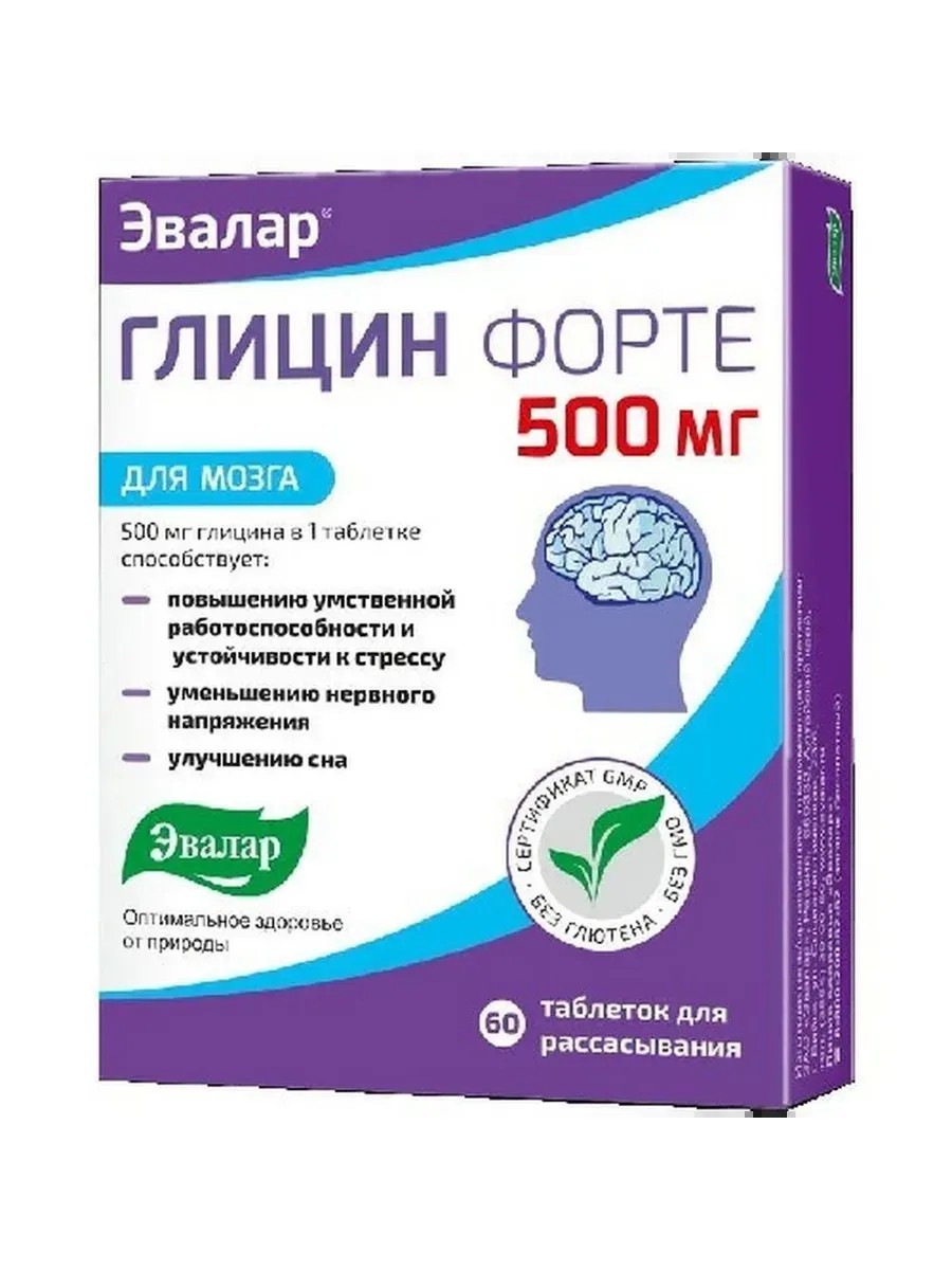 Glycine Forte 500mgEach tablet contains an increased content of glycine (500 mg), enhanced by brain vitamins B1, B6, B12.Active ingredient: glycine, cyanocobalamin (vitamin B12), pyridoxine hydrochloride (vitamin B6), thiamine hydrochloride (vitamin B1).Action: to reduce nervous and mental stress, increase resistance to stress, improve mood and sleep, increase mental performance, memory and attention.Glycine Forte Evalar 500 mg is distinguished by:1. Increased glycine content (500 mg).2. The effect of glycine is enhanced by vitamins B1, B6, B12 in the same ratio as they exist in nature.B vitamins have a beneficial effect on the central and peripheral nervous system, promote the restoration of damaged nerve fibers, and help counteract stress.3. The tablets dissolve easily, which helps to quickly achieve the effect. 2 tablets (daily intake) contain: Glycine 1000 mg, Pyridoxine (vitamin B6) 6 mg, Thiamine (vitamin B1) 5 mg, Vitamin B12 9 mcg.