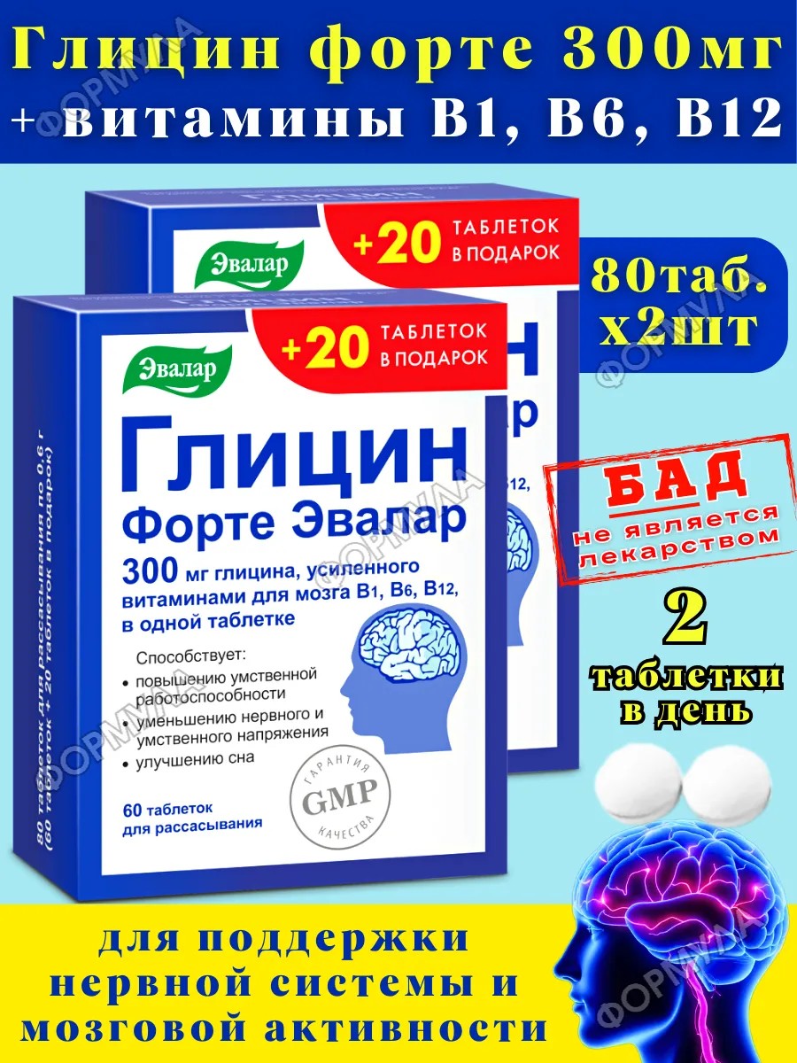 Эвалар Глицин Форте с витаминами группы В для мозга 60+20таб*2уп