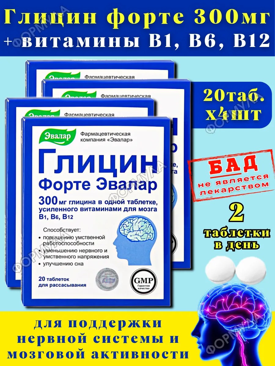 Эвалар Глицин Форте с витаминами группы В для мозга 20таб*4уп