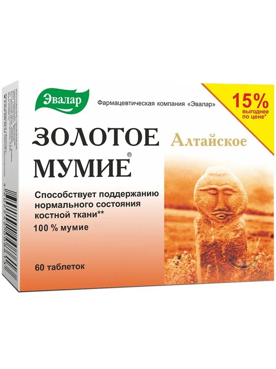 Золотое мумие от компании Эвалар – это 100% очищенное алтайское мумие, изготовленное по оригинальной технологии, которая позволяет максимально сохранить активно действующие вещества: витамины, аминокислоты и более 30 микро- и макроэлементов с высокой биодоступностью. Настоящий золотой стандарт алтайского мумие! Золотое мумие алтайское очищенное способствует:-поддержанию нормального состояния костной ткани;-повышению защитных сил организма.-