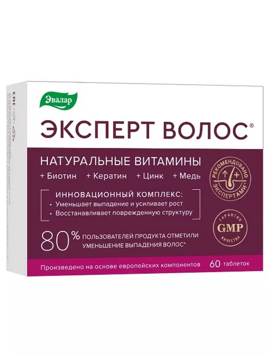 ЭКСПЕРТ ВОЛОС - таблетки, питание волос изнутри! Содержит натуральные витамины, которые усваиваются лучше синтетических.Внешний вид и свойства: таблетки, покрытые плёночной оболочкой, белого цветаАктивное вещество: автолизат пивных дрожжей, таурин, цистин, хвощ, биотин, оксид цинка, цинк.Действие: для уменьшения выпадения волос и улучшения их состояния.Содержание в 2 таблетках (суточном приеме):Автолизат пивных дрожжей (источник натуральных витаминов) 300 мг, Таурин, не менее 150 мг, Цистин 100 мг, Экстракт хвоща полевого 60 мг, Цинка оксид, 15 мг, в том числе цинк, не менее 12 мг, Биотин 150 мкг.Эксперт волос таблетки для уменьшения выпадения волос - инновационный комплекс натуральных витаминов (из автолизата пивных дрожжей), усиленный аминокислотами и микроэлементами для здоровья и красоты волос, способствует: укреплению волосяных луковиц, восстановлению поврежденной структуры волос; уменьшению выпадения волос, усиленному росту волос, в том числе после вирусных заболеваний, увеличению объема волос и появлению блеска, нормализации работы сальных желез и улучшению состояния кожи головы.Что делать, если, несмотря на прием витаминов, волосы ослаблены, выпадают и секутся, потускнели и утратили объем? Может быть, ваши витамины недостаточно усваиваются организмом? Такое возможно, если витамины синтетические.Попробуйте натуральные витамины в составе биологически активного комплекса Эксперт волос.Установлено, что натуральные витамины усваиваются гораздо лучше.Эксперт волос содержит натуральные витамины группы В, незаменимые аминокислоты и ферменты, которые дополнительно усилены хвощем, таурином, цистином, цинком и биотином.Источник натурального кремния (хвощ) в составе таблеток для волос Эксперт волос повышает образование коллагена, необходимого для здоровья волос и кожи. Он питает волосы изнутри, придавая им блеск и здоровый вид.Аминокислоты таурин и цистин обеспечивают необходимые условия для роста крепких и сильных волос, предупреждают их выпадение, обеспечивают им упругость, эластичность и здоровую текстуру. Цинк необходим для интенсивного роста и развития волос.Биотин(содержит серу) можно назвать витамином красоты. Регулирует содержание жира в коже, обеспечивая блеск и красивый внешний вид волос.Принимайте Эксперт волос и откройте для себя, насколько красивыми - густыми и блестящими - могут быть ваши волосы!Какие витамины пить при выпадении волос?Городским жителям сложно обеспечить поступление в организм всех необходимых питательных веществ. Специалисты компании «Эвалар» разработали биологически активную добавку «Эксперт волос», которая не относится к витаминам от выпадения и для роста волос, но содержит в своём составе полезные компоненты.Сюда входят витамины группы В натурального происхождения, ферменты и незаменимые аминокислоты (таурин, цистин). Включение биотина, цинка и хвоща обогащает формулу.Хвощ полевой - природный источник кремния, который активизирует образование коллагена, способствуя упругости и эластичности волос.Аминокислоты являются строительным материалом для здоровых и красивых волос. Цистин включает в себя серу, которая способствует защите волос от внешних факторов, устранению ломкости, возвращению блеска.Биотин - витамин группы В, способствует уменьшению выпадения волос и сохранению здоро