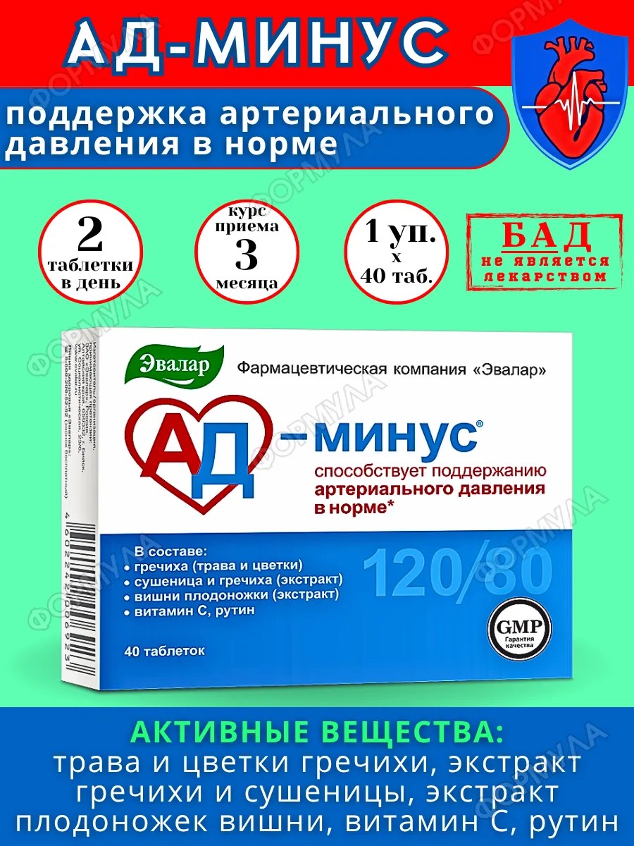 Эвалар Ад Минус для поддержания артериального давления 40таб*1уп