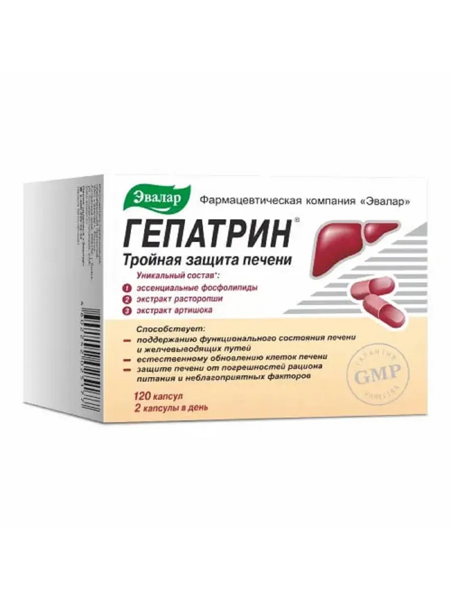 Гепатрин содержит сразу три активных компонента для синергического тройного действия на печень: Гепатрин Эвалар способствует: Естественному обновлению клеток печени- Мягкому очищению желчных протоков- Защите клеток печени от неблагоприятных факторов. Взрослым -по 1 капсуле 2 раза в день во время еды. Продолжительность приёма - не менее 1 месяца. Рекомендуется длительный прием - 3-6 месяцев с регулярным повторением курсов. Показания: Рекомендуется в качестве биологически активной добавки к пище - дополнительного источника фосфолипидов, флаволигнанов расторопши (силимарина), витаминов Е, В6, тиамина, рибофлавина. Противопоказания: Индивидуальная непереносимость компонентов, беременность, кормление грудью. Особые указания:Биологически активная добавка к пище. Не является лекарством. Перед применением необходимо проконсультироваться с врачом. Температура хранения от 2℃ до 25℃.