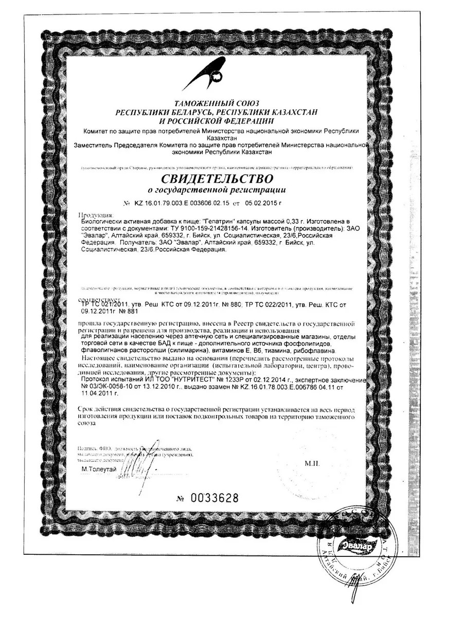 | Торговое наименование | Биологически активная добавка к пище: "Гепатрин" капсулы массой 0,33 г |