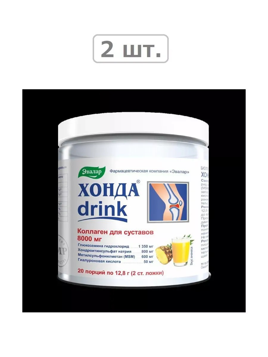 хонда drink 256,0 пор/банка. Состав: коллагеновый гидрализат, глюкозамина гидрохлорид, хондроитин сульфат, метилсульфонилметан, гиалуроновая кислота, витамин С, В2, глюконат марганца, сукралоза, фруктоза, лимонный сок порошкообразный, ароматизатор натуральный "Ананас", кислота лимонная