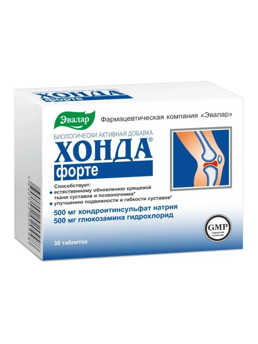 Оптимальные дозировки хондроитина и глюкозамина – по 500 мг – для естественного обновления хрящевой ткани суставов и позвоночника, улучшения подвижности и гибкости суставов. После 30ти лет многие вещества, важные для суставов, вырабатываются в организме значительно меньше, и мы сразу ощущаем их нехватку: характерные скрип и хруст, дискомфорт и чувство скованности. А если учесть современный образ жизни: нерациональное питание и лишний вес, малоподвижная работа или, наоборот, регулярные интенсивные тренировки в спортзале – при такой ежедневной нагрузке на суставы без дополнительной помощи не обойтись. Поэтому сегодня одним из самых современных направлений в поддержке здоровья суставов является использование хондропротекторов. Они совершенно естественны для нашего организма и являются строительным материалом для суставов. Хонда Форте от компании Эвалар обладает хондропротекторными свойствами и способствует:-Естественному обновлению хрящевой ткани суставов и позвоночника-Улучшению подвижности и гибкости суставов-Снижению болезненности, чувства дискомфорта и напряжения в области суставов и позвоночника-Снижению риска разрушения хрящевой ткани-Как работают ингредиенты? Хондроитин и глюкозамин — это, пожалуй, одни из самых востребованных комплексных хондропротекторов для поддержания здорового состояния хрящевой ткани. Они представляют собой структурные элементы самого хряща, необходимые для построения клеток хрящевой ткани и её естественного обновления. Хондроитинсульфат натрияподдерживает функциональную способность суставов и снижает дискомфорт движений. Он защищает хрящ и обладает способностью поддерживать естественное обновление клеток хрящевой ткани. Глюкозамина гидрохлорид является тем природным компонентом, который обеспечивает защиту клеток хрящевой ткани, стимулирует выработку коллагена, является структурным компонентом сухожилий, суставной жидкости, соединительной ткани, кожи и костей. Добавление в состав Хонда форте экстракта коры ивы белой и экстракта корня лопуха дополнительно способствует поддержанию функционального состояния хрящевой ткани и водно-солевого обмена.br/Хондроитинсульфат натрия - 500 мг, Глюкозамина гидрохлорид - 500 мг