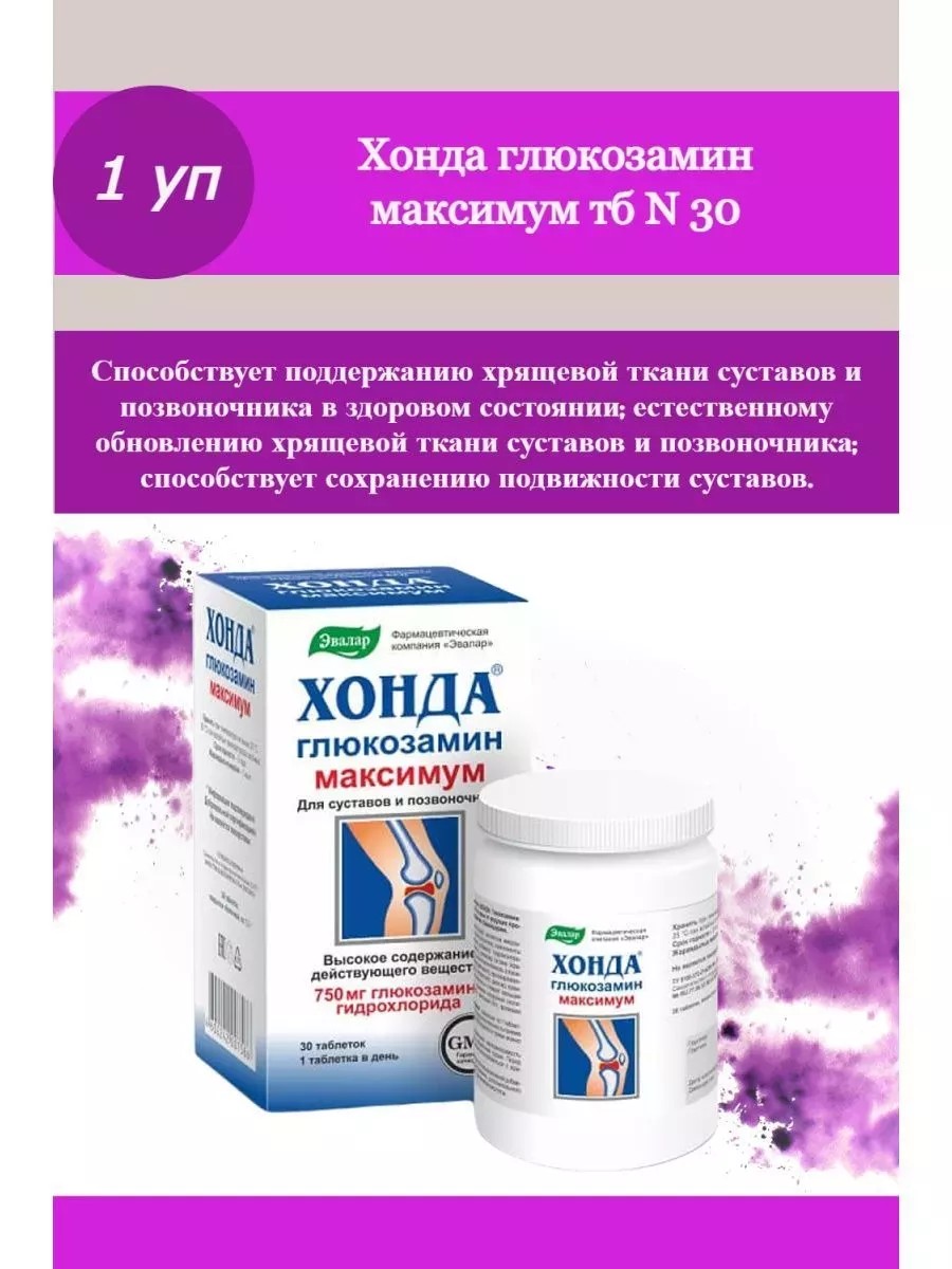 Хонда глюкозамин максимум - это биологически активная добавка, которая содержитлюкозамина гидрохлорид и витамин группы B. Глюкозамин является естественным компонентом суставного хряща, в организме используется хондроцитами как исходный материал для синтеза хондроитина и гиалуроновой кислоты, стимулирует синтез коллагена, которые так необходимы для нормального функционирования суставов. Витамины группы В (В2, В6, В12, фолиевая кислота) способствуют нормальному функционированию хрящевых тканей. Применение Глюкозамина Максимум рекомендуется при заболеваниях и травмах суставов, а также для их профилактики.