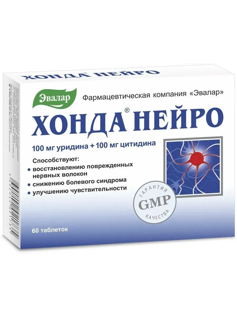 Компоненты Хонда Нейро способствуют восстановлению нервных волокон и снижению болевого синдрома в шее и спине, благодаря оптимальным дозировкам уридина и цитидина (100 мг + 100 мг)! Хонда Нейро – это комплекс для восстановления нервных волокон на основе цитидина, уридина и витамина В6, веществ, необходимых для функционирования нервной системы, ее укрепления и уменьшения неприятных ощущений в суставах и позвоночнике. Хонда Нейро способствует: восстановлению поврежденных нервных волокон; нормализации передачи нервных импульсов; улучшению чувствительности поврежденного участка; снижению интенсивности болевого синдрома (в т. ч. в суставах и позвоночнике); снижению дальнейшего повреждения нервной ткани. Оптимальный курс приема – не менее 2 месяцев с регулярными повторениями.