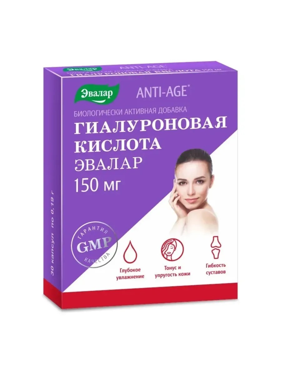 Гиалуроновая кислота — одно из самых популярных средств для молодости кожи.Чтобы доставить это удивительное вещество в глубокие слои кожи и запустить процесс омоложения изнутри, компания Эвалар предлагает новинку: Гиалуроновая кислота 150 мг в капсулах для приема внутрь. В здоровой коже высокомолекулярные и низкомолекулярные фракции гиалуроновой кислоты находятся в динамическом равновесии и обладают хорошими влагоудерживающими и восстанавливающими свойствами. Именно в таком соотношении высокомолекулярные и низкомолекулярные фракции гиалуроновой кислоты содержатся в Гиалуроновая кислота 150 мг от Эвалар. Максимум гиалуроновой кислоты — 150 мг — в 1 капсуле способствует:-глубокому увлажнению кожи, улучшению ее тонуса и упругости;-замедлению процесса формирования морщин и старения кожи;-защите от фотостарения;-сохранению подвижности и гибкости суставов;-защите хрящевой ткани от разрушения;-устранению сухости глаз;-повышению эффективности наружных косметических средств при совместном применении.-Гиалуроновая кислота необходима не только коже:это очень важный компонент внутрисуставной жидкости и хряща. Хрящ играет роль амортизатора, уменьшая давление на кости и обеспечивая их легкое скольжение относительно друг друга. Дефицит гиалуроновой кислоты также приводит кувеличению трения в суставе и его постепенной деформации. Применение гиалуроновой кислоты внутрь в виде капсул или таблеток в высокоразвитых странах является «золотым стандартом» комплексного подхода к решению проблем возрастных изменений кожи, волос, суставов, сердечно-сосудистой системы, глаз.