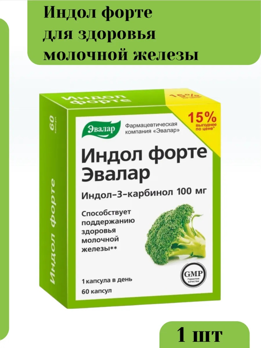 "Индол форте" от компании "Эвалар" - это натуральный БАД, который не содержит синтетических гормонов, не вызывает соответствующих побочных эффектов и привыкания. Препарат разработан, чтобы помочь: поддержать баланс женских половых гормонов; снизить риск развития патологий молочных желез; предотвратить формирование уплотнений;уменьшить болезненность в груди; снизить вероятность инфицирования ВПЧ (вирусом папилломы человека). ВПЧ высокого онкогенного риска могут спровоцировать рак груди.Основной действующий компонент в составе БАД-индол-3-карбинол (экстракт брокколи). Дополнительно препарат обогащен концентратом брокколи, усиливающим действие индол-3-карбинола почти в 80 раз. Даже один курсовой прием "Индола-форте" позволяет добиться высоких результатов. На 1 курс достаточно купить 1 упаковку.