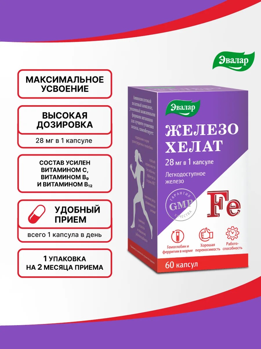 Iron Chelate Evalar is a dietary supplement with a chelated form of iron and coenzyme vitamins to improve the absorption of the mineral and support the body.