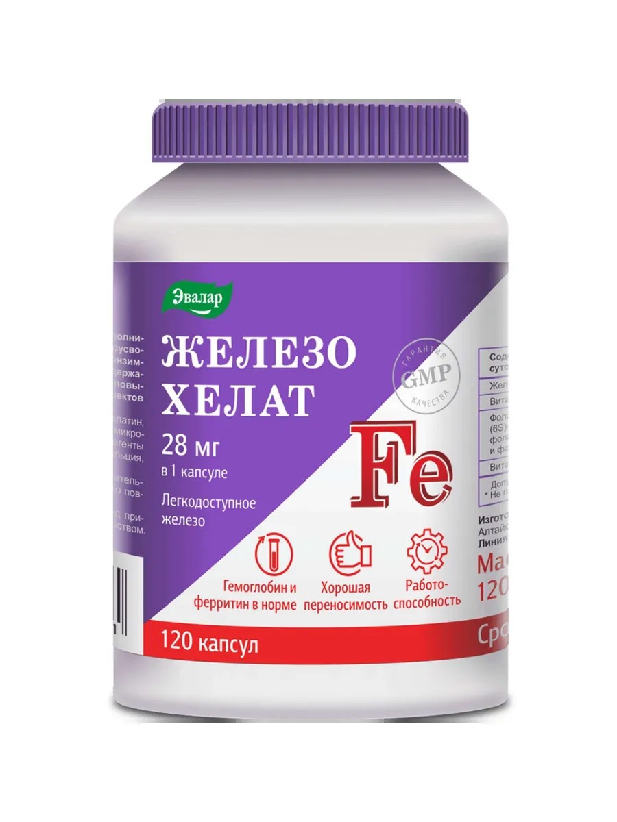 Легко усваиваемый хелатный комплекс Железо хелат Эвалар. Железо хелат Эвалар содержит высокую дозировку железа (28 мг в 1 капсуле) и необходимые для лучшего усвоения железа витамины нового поколения в коэнзимных формах (витамин С, В9 и В12).Коэнзимным формам витаминов не требуется времени на активацию. Они вступают в реакцию сразу и поэтому могут использоваться организмом быстрее и эффективнее.Железо хелат Эвалар способствует: поддержанию в норме уровня ферритина и гемоглобина снижению риска развития анемии снижению усталости повышению работоспособностиПреимущества Железо хелат Эвалар:1. хорошо усваивается без побочных эффектов со стороны ЖКТ (не вызывает вздутия, запоров и диареи), так как не влияет на уровень кислотности желудка;2. высокая дозировка - 28 мг в 1 капсуле3. состав усилен витаминами нового поколения в коэнзимных формах (витамин С, витамин В9 и В12) для лучшего усвоения4. удобный приём - всего 1 капсула в день5. разрешен беременным и кормящим