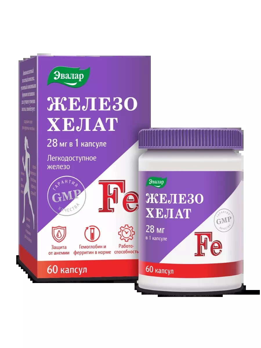 : ЖЕЛЕЗО ХЕЛАТ - Биологически активная добавка (БАД) к пище - легкодоступное железо в хелатной форме. Без побочных эффектов со стороны ЖКТ. Активное вещество: Железа аминокислотный хелат (железа бисглицинат) витамин С витамин В9 (фолат) витамин В12 Действие: Для максимального усвоения железа поддержания в норме уровня ферритина и гемоглобина Содержание в 1 капсулее (суточном приеме) и % от рекомендуемого уровня суточного потребления (адекватного уровня): Железо (в форме железа бисглицината) 28 мг 200%* Витамин С 30 мг 50% Фолат (Витамин В9) 400 мкг 200%* Витамин В12 8 мкг 800%* Допускаются отклонения в соответствии с ТУ 10. 89. 19-444-21428156-2022. *Не превышает верхний допустимый уровень суточного потребления. Усталость сонливость головокружение одышка и раздражительность - вам знакомы эти симптомы? Возможно вашему организму не хватает железа. По данным ВОЗ каждый пятый житель планеты страдает железодефицитной анемией в той или иной степени. Железо - один из самых важных минералов необходимых для нашего здоровья. Все ткани и органы человеческого организма функционируют только в присутствии железа. Для максимального усвоения1 железа попробуйте легко усваиваемый хелатный комплекс Железо хелат Эвалар. Железо хелат Эвалар содержит высокую дозировку железа (28 мг в 1 капсуле) и необходимые для лучшего усвоения железа витамины нового поколения в коэнзимных формах (витамин С В9 и В12). В отличие от обычных коэнзимным формам витаминов не требуется времени на активацию. Они вступают в реакцию сразу и поэтому могут использоваться организмом быстрее и эффективнее. ЖЕЛЕЗО ХЕЛАТ ЭВАЛАР СПОСОБСТВУЕТ: поддержанию в норме уровня ферритина и гемоглобина снижению риска развития анемии снижению усталости повышению работоспособности ПРЕИМУЩЕСТВА ЖЕЛЕЗО ХЕЛАТ ЭВАЛАР: 1. хорошо усваивается без побочных эффектов со стороны ЖКТ (не вызывает вздутия запоров и диареи) так как не влияет на уровень кислотности желудка; 2. высокая дозировка - 28 мг в 1 капсуле 3. состав усилен витаминами нового поколения в коэнзимных формах (витамин С витамин В9 и В12) для лучшего усвоения 4. удобный приём - всего 1 капсула в день 5. разрешен беременным и кормящим2 КАК РАБОТАЮТ ИНГРЕДИЕНТЫ? Важнейшие функции железа: 1. Участвует в транспортировке кислорода к клеткам сосудам и тканям т. к. является важнейшим составляющим элементом гемоглобина3 2. Отвечает за качество иммунного ответа и участвует в процессах тканевого дыхания4 3. Участвует в обменных процессах разрушает и выводит из организма токсины3 4. Предупреждает развитие анемии4 Для того чтобы железо попало в клетку и связалось с белком ферритином ему необходимы витамины С В9 и В12. Ферритин накапливает железо в организме и обеспечивает любую его экстренную потребность что предупреждает падение уровня гемоглобина и снижает риск развития анемии. Кроме того витамины С В9 и В12 участвуют в образовании и созревании эритроцитов. Железо хелат Эвалар - лучший выбор для «железного здоровья»! 1 В ассортименте ЗАО «Эвалар» (высокий процент усвоения за счет хелатной формы). 2 По назначению врача. 3 Поляков В. И. Экзамен на «Homo sapiens II» (От концепции естествознания ХХ века - к естествопониманию). - Москва. Изд-во Академия естествознания. 2008 г. 4 Н. Г. Колосова Г. Н. Баяндина Н. Г. Машукова Н. А. Геппе / Обмен железа в организме и пути коррекции его нарушений / - Кафедра детских бол