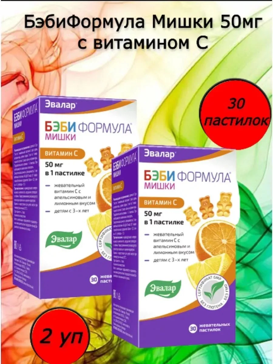 Специально для восполнения недостатка витамина С и поддержания его уровня для детей с 3 лет компания «Эвалар» разработала витаминный препарат Бэби Формула Мишки Витамин С в форме вкусных мармеладных мишек. Каждая пастилка содержит 100% суточной нормы витамина С - 50 мг. Благодаря этому Бэби Формула Мишки Витамин С способствует: Обогащению организма необходимым количеством витамина С; Укреплению защитных сил организма, что особенно актуально в сезон простуд; Полноценному развитию организма ребенка. РЕКОМЕНДАЦИИ ПО ПРИМЕНЕНИЮ: детям от 3 до 7 лет по 1 жевательной пастилке 1 раз в день во время еды, детям старше 7 лет по 1 жевательной пастилке 2 раза в день во время еды. Продолжительность приема - 1-2 месяца. При необходимости прием можно повторить.