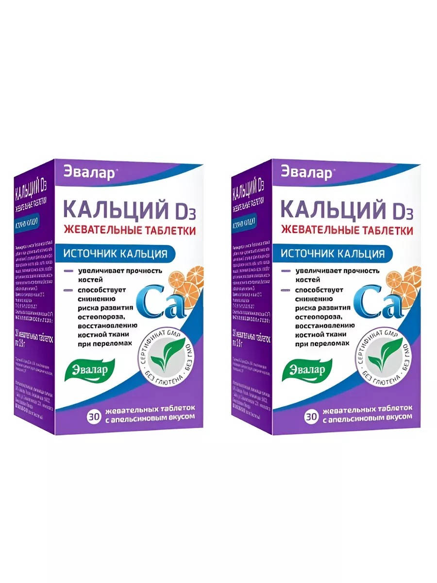 КАЛЬЦИЙ D3 - жевательные таблетки с приятным апельсиновым вкусом.Среди минералов и микроэлементов, необходимых в любом возрасте, одним из самых важных считается кальций. К сожалению, он быстро выводится из организма. И при его дефиците кости становятся пористыми и хрупкими, что может привести к риску перелома и возникновению остеопороза.Для пополнения запасов кальция в организме необходимы рациональное питание, а также дополнительная поддержка в виде биологически активных добавок, поскольку даже самое правильное питание не покрывает потребности организма в кальции.Для чего необходим дополнительный прием кальция? Кальций - строительный материал для костей и зубов. Во-первых, он увеличивает плотность и прочность костей. Во-вторых, предотвращает остеопороз. В-третьих, это профилактика кариеса.Именно поэтому фармацевтической компанией «Эвалар» разработаны жевательные таблетки с приятным апельсиновым вкусом Кальций D3. Ингредиенты высокого качества из Германии и Швейцарии подобраны так, чтобы обеспечить организм необходимым количеством кальция. Состав комплекса усилен витамином D3, который работает совместно с кальцием, облегчая его усвоение и поддерживая силу и здоровье костной ткани. Витамин D не только повышает способность желудочно-кишечного тракта к усвоению кальция, но и мобилизует минеральные вещества в других местах организма и направляет их в кости.Сбалансированный состав жевательных таблеток Кальций D3 Эвалар:• восполняет дефицит кальция и витамина D3,• регулирует обмен кальция и фосфора в организме (в костях, зубах, ногтях, волосах, мышцах),• увеличивает прочность костей,• способствует снижению риска развития остеопороза, восстановлению костной ткани при переломах.Содержание в 2 жевательных таблетках (суточном приеме)Кальций, не менее 1000 мгВитамин D, не менее 10 мкг (400 МЕ)