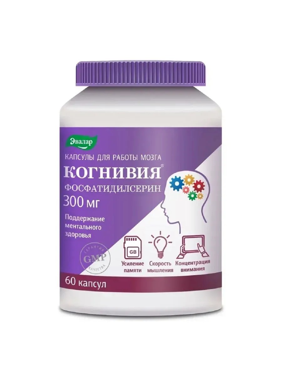 Когнивия фосфатидилсерин - комплекс для оптимизации работы и здоровья когнитивной системы.Активное вещество:Фосфатидилсерин, фосфатидилхолин, коэнзим Q10.Действие:Для поддержания ментального здоровья, усиления памяти, скорости мышления, концентрации внимания.Современная жизнь требует высокой умственной активности, чтобы выдерживать бешеный темп, многозадачность, информационные перегрузки. При этом современное питание не обеспечивает идеального баланса жирных кислот (фосфолипидов) для поддержания целостности клеток мозга.Все это может приводить к стрессу - основной причине ухудшения работы мозга, снижения памяти и внимания.Как помочь мозгу?Справляться с перегрузками и повышать продуктивность рабочего дня помогают капсулы для работы мозга Когнивия Фосфатидилсерин.В их составе комплекс специальных компонентов для энергии мозга -фосфолипидов (фосфатидилсерина, фосфатидилхолина) и коэнзима Q10.Когнивия Фосфатидилсерин способствует:• улучшению показателей работы мозга - повышению обучаемости и скорости мышления, усилению памяти и концентрации внимания, в том числе при интенсивной умственной деятельности и старении;• замедлению возрастного снижения функции мозга, восстановлению поврежденных и стареющих нейронов;• стабилизации настроения, уменьшению тревоги и депрессии;• антиоксидантному действию - защите нейронов мозга от повреждения свободными радикалами;• поддержанию ментального здоровья.Кому и в каких случаях подходит:активным людям, образ жизни которых - «включен 24/7»;офисным работникам, стремящимся оставаться в интеллектуальном тонусе в течение всего дня;студентам - при сдаче экзаменов, при обучении, при интенсивных умственных нагрузках;спортсменам и киберспортсменам, рассчитывающим сохранить свои когнитивные (познавательные) функции в лучшем виде;пожилым людям - в качестве профилактики потери памяти и возрастного снижения умственных способностей.Удобство приема и еще два преимущества капсул Когнивия Фосфатидилсерин:1. Максимальное содержание активного вещества (фосфатидилсерина) - 150 мг*.2. Натуральный холин (фосфатидилхолин) вместо синтетического, как в зарубежном аналоге.3. Удобный прием. Упаковки хватит на 1 месяц, даже если вы принимаете максимальную дневную дозировку фосфатидилсерина (300 мг).Как работают ингредиентыФосфатидилсерин - главный фосфолипид мозга. Формирует внутренний слой клеточных мембран, обеспечивает нормальную работу мозга и нервной системы. Осуществляет транспортировку питательных веществ в клетку, стимулирует обменные процессы и синтез нейромедиатора ацетилхолина, способствует активации метаболизма глюкозы в головном мозге и повышает устойчивость нервных клеток к ишемическому поражению.Фосфатидилхолин - фосфолипид, который вырабатывает важный нейромедиатор ацетилхолин. Участвует в работе памяти, обмене веществ, замедляет процесс старения клетки.Коэнзим Q10 - важен для всего организма. В первую очередь - для создания АТФ - главного источника энергии, при дефиците которого повышается утомляемость, вялость, снижается работоспособность. Кроме того, коэнзим Q10 - один из самых мощных антиоксидантов для защиты клеток от повреждений и сбоев, замедления старения и омоложения.Важно, что запасы фосфатидилсерина в организме пополнять за счет питания невозможно, он содержит