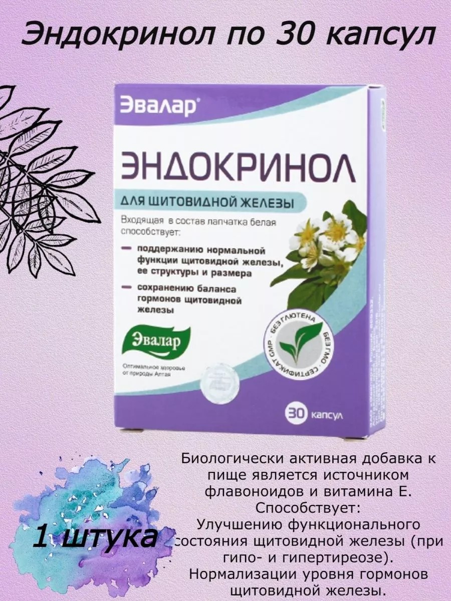 ЭНДОКРИНОЛ - негормональное средство для поддержания нормальной функции щитовидной железы, ее структуры и размера, сохранения баланса ее гормонов. Способствует: - Улучшению функционального состояния щитовидной железы (при гипо- и гипертиреозе), - Нормализации уровня гормонов щитовидной железы. РЕКОМЕНДАЦИИ ПО ПРИМЕНЕНИЮ: взрослым по 2 таблетки (капсулы) в день во время еды. Продолжительность приема - 3 месяца.