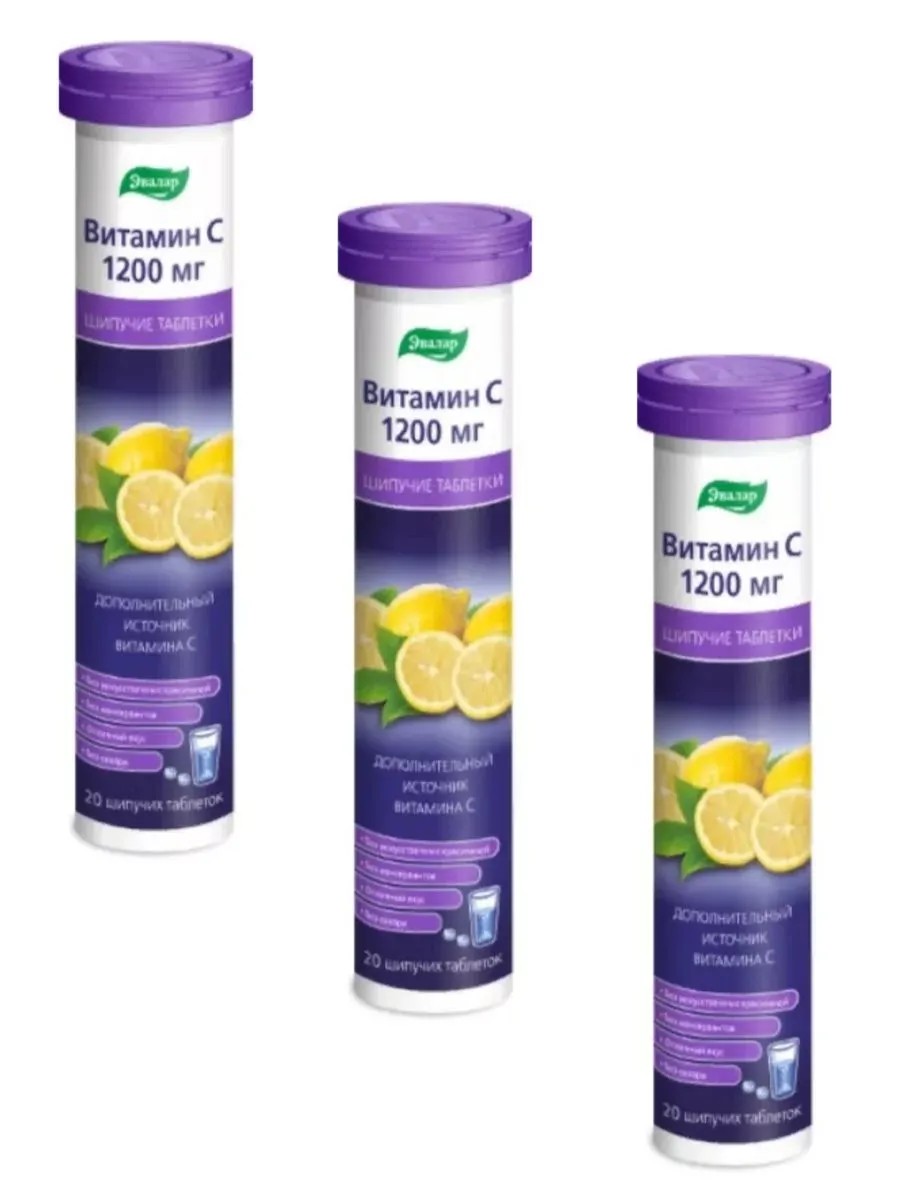 Витамин С 1200 мг таблетки шипучие растворимые БАД, в одной упаковке 20 штук.: Витамин С:являясь антиоксидантом, предохраняет мембраны клеток и, в частности лимфоцитов от повреждающего действия перекисного окисления (иммуностимулирующий эффект);стимулирует рост, участвует в окислительных процессах, тканевом дыхании, обмене аминокислот, улучшает использование углеводов и нормализует обмен холестерина;стимулирует деятельность эндокринных желез, особенно надпочечников, улучшает функцию печени, способствует усвоению железа и нормальному кроветворению, влияет на обмен многих витаминов;повышает сопротивляемость организма инфекциям, интоксикациям химическими веществами, перегреванию, охлаждению, кислородному голоданию.Преимуществом шипучих таблеток является быстрое и полное усвоение витамина C организмом, насыщение тела витамином на длительное время и удобство применения. Данная добавка подходит для взрослых: взрослым по 1/2 таблетки 1 раз в день, предварительно растворив в 100 мл воды комнатной температуры. Продолжительность приема -10 дней. При необходимости прием можно повторить. Отныне поддерживать здоровья легко и удобно с Витамином С 1200 мг в форме шипучих таблеток.Состав: аскорбиновая кислота (витамин С); лимонная кислота и гидрокарбонат натрия (регуляторы кислотности), декстроза; поливинилпирролидон и полиэтиленгликоль (носители), сукралоза (подсластитель), рибофлавин 5-фосфат натрия, ароматизаторы "Лимон" и "Апельсин".1 таблетка содержит:Витамин С 1200 мг.Витамин В2 5 мг.Противопоказания: индивидуальная непереносимость продукта, беременность, кормление грудью. Перед применением рекомендуется проконсультироваться с врачом.Способ применения и дозы: взрослым по 1/2 таблетки 1 раз в день, предварительно растворив в 100 мл воды комнатной температуры. Продолжительность приема -10 дней.При необходимости прием можно повторить.Температура хранения от 2℃ до 25℃.