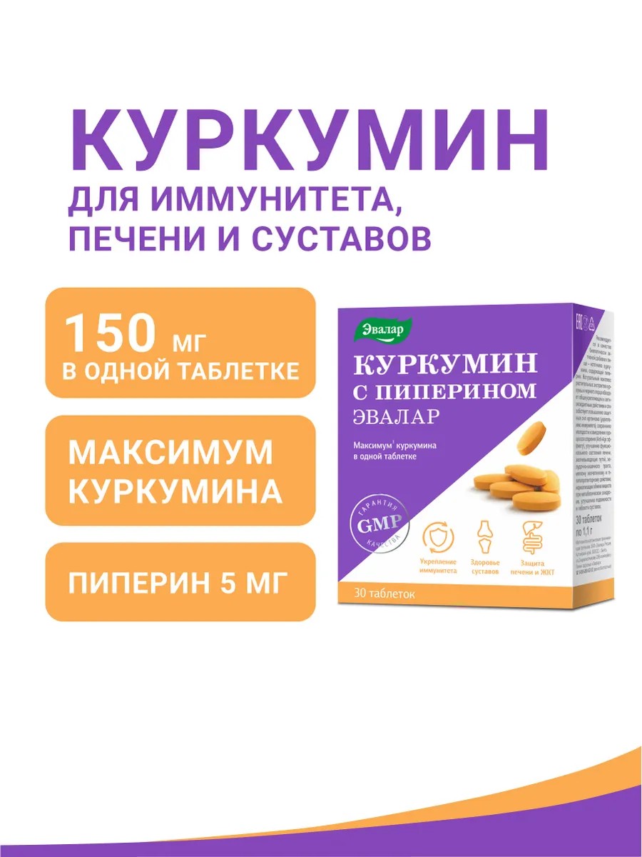 Эвалар Куркумин с пиперином, для иммунитета, для суставов, 30 табл