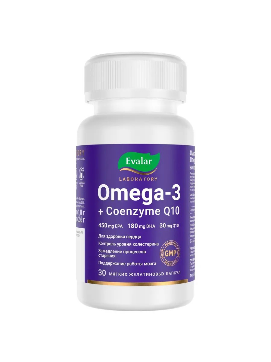 Омега-3 + Коэнзим Q10 от Evalar Laboratory -это оптимальное сочетание питательных веществ для здоровья сердца и всего организма. Оба компонента очищаются с помощью запатентованного процесса, гарантирующего отсутствие загрязняющих веществ и насыщенных жиров. При производстве используется коэнзим Q10, который является полностью натуральным, а значит он не содержит примесей и аллергенов. Для предотвращения прогоркания используется смесь натуральных токоферолов, а также все этапы работы с концентрированным рыбьем жиром проводятся в безвоздушной среде азота. Требования, предъявляемые к качеству, позволяют строго контролировать наиболее критические показатели чистоты и качества рыбьего жира.В каждой капсуле Омега-3 + Коэнзим Q10 от Evalar Laboratory содержатся оптимальные концентрации коэнзима в высокоусвояемой форме убихинона -100% суточной нормы. Удобный прием всего 1 капсула в день позволит поддержать работу сердца, мозга и глаз.Упаковка рассчитана ровно на 30 дней приема.
