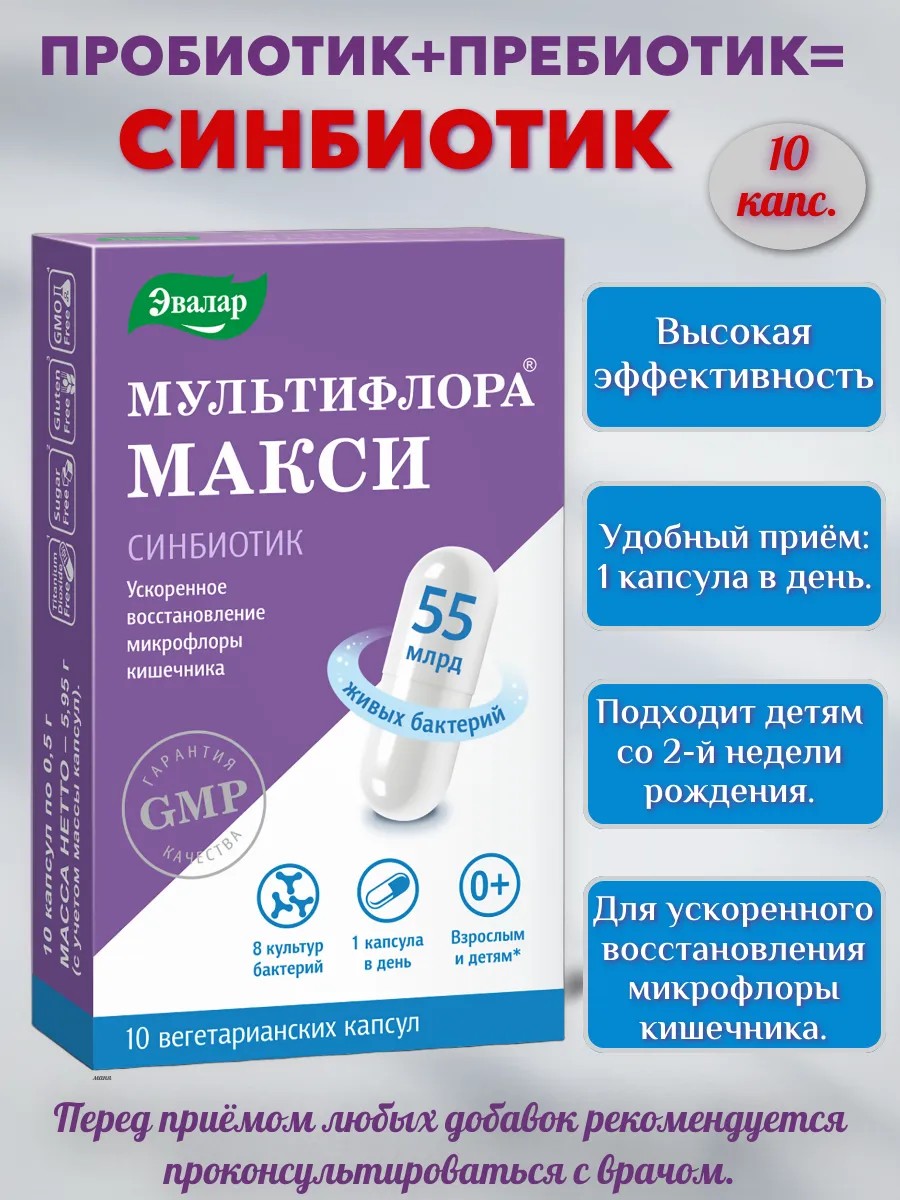Мультифлора Макси №10 Эвалар – это комплексный продукт нового поколения, разработанный специально для восстановления баланса и здоровья кишечника. Этот продукт имеет широкий спектр действия и способен эффективно регулировать процессы, связанные с нарушением микрофлоры, такие как накопление токсинов и воспаление слизистой оболочки кишечника.