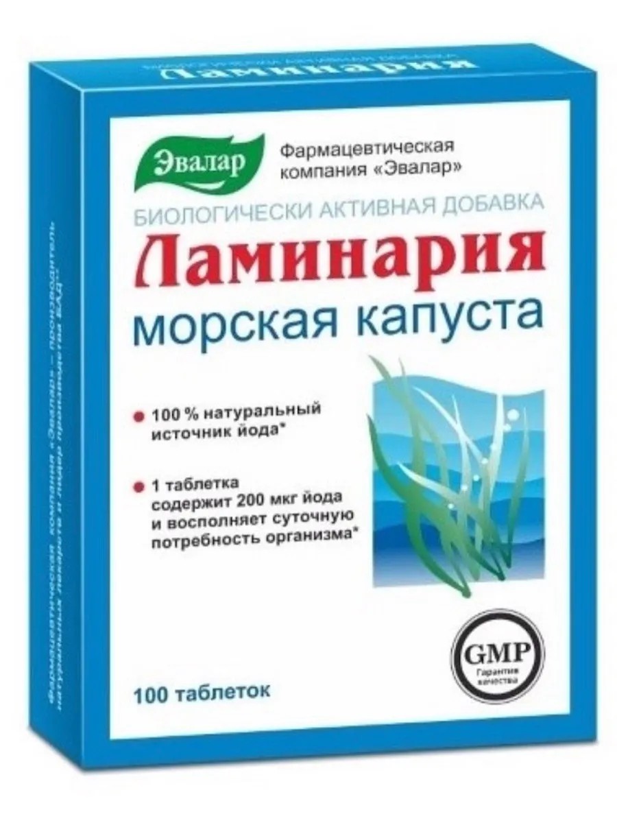 Why is iodine essential for the body? Iodine is a vital micronutrient; without it, the thyroid gland cannot function properly. Iodine is the main component of thyroid hormones, which are involved in: - the regulation of protein, fat, carbohydrate and energy metabolism in the body - the development of all organs and systems - regulate the activity of the brain, nervous and cardiovascular systems, the hormonal system - the growth and development of children, the formation of their intellectual abilities. Laminaria is a perfectly balanced seafood product created by nature itself, which, in addition to iodine, contains: - alginic acid and its salts (up to 21%) - mannitol (20-25%) - kelp polysaccharide (up to 21%) - protein substances (up to 9%) - L-fructose (up to 4%) - vitamins: A, B1, B2, B12, C, D, E, pantothenic and folic acids - 40 micro- and macroelements in a form easily absorbed by the body: bromine, manganese, cobalt, zinc, magnesium, Iron, potassium, sodium, sulfur, phosphorus, nitrogen. Directions: Adults and children over 14 years of age—1 tablet once daily with meals. Duration of treatment: 2–3 months, can be repeated 3–4 times a year. Regular use is permitted.