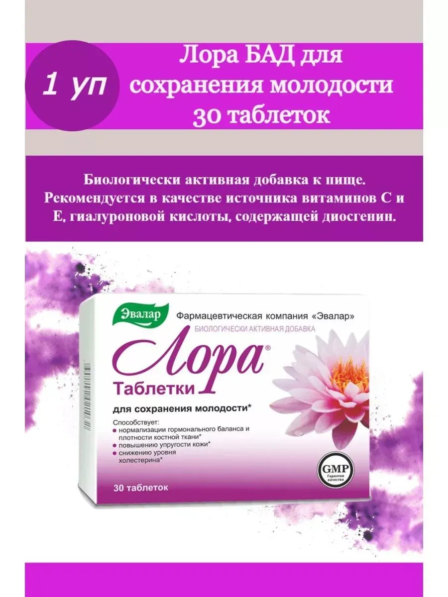 Таблетки Лора Эвалар - натуральный продукт, который содержит фитоэстрогены дикого ямса, гиалуроновая кислота, витамины С и Е повышают упругость кожи, усиливая выработку коллагена, эластина и гиалуроновой кислоты. Активные компоненты антивозрастного комплекса Лора продлевают жизненный цикл клеток. Клетки начинают работать в режиме молодых и здоровых. В результате усиливается синтез коллагена, эластина и других компонентов, отвечающих за упругость эластичность, подтянутость кожи.Таблетки Лора Эвалар рекомендуются к применению для повышения упругости кожи, омоложения кожи, профилактики морщин.РЕКОМЕНДАЦИИ ПО ПРИМЕНЕНИЮ:взрослым по 1 таблетке 1 раз в день во время еды. Продолжительность приема - не менее месяца. При необходимости прием можно продолжать.