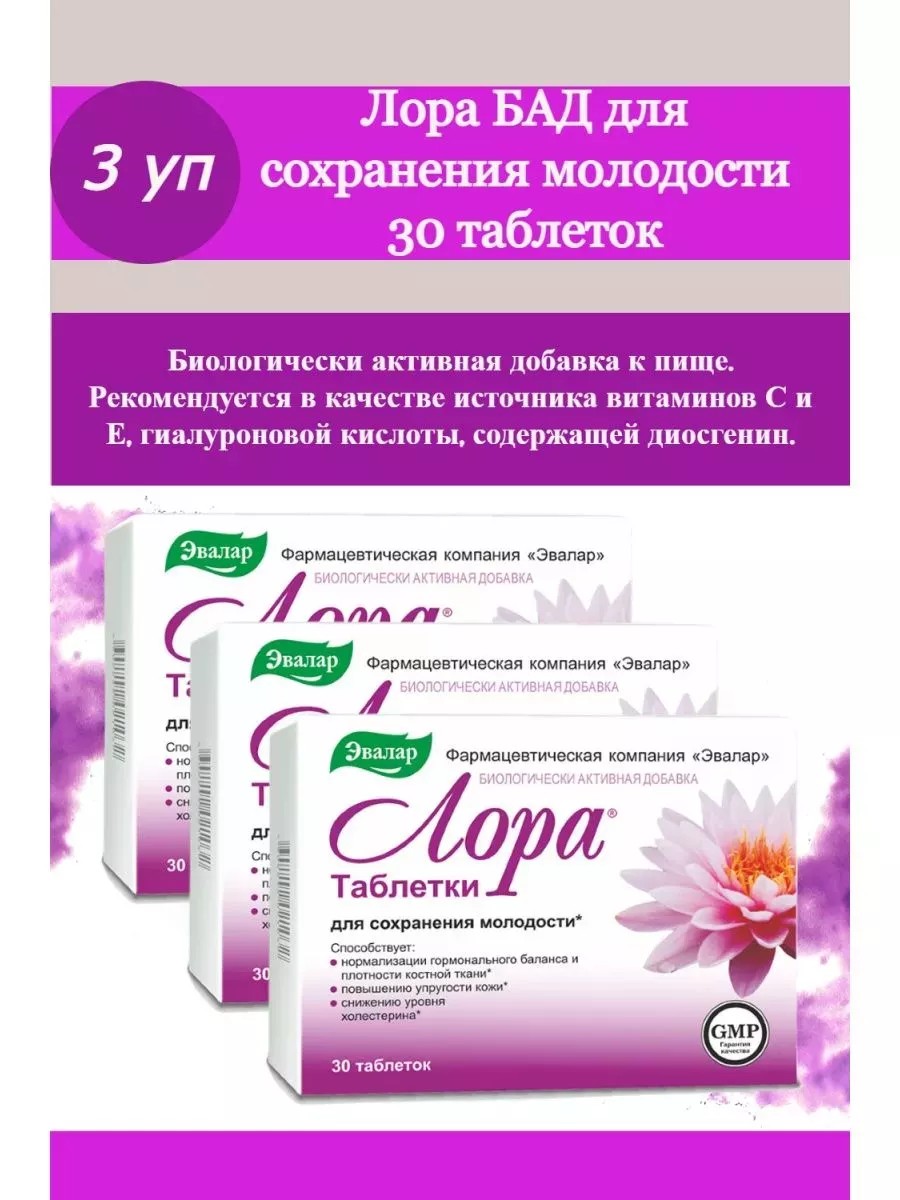 Таблетки Лора Эвалар - натуральный продукт, который содержит фитоэстрогены дикого ямса, гиалуроновая кислота, витамины С и Е повышают упругость кожи, усиливая выработку коллагена, эластина и гиалуроновой кислоты. Активные компоненты антивозрастного комплекса Лора продлевают жизненный цикл клеток. Клетки начинают работать в режиме молодых и здоровых. В результате усиливается синтез коллагена, эластина и других компонентов, отвечающих за упругость эластичность, подтянутость кожи.Таблетки Лора Эвалар рекомендуются к применению для повышения упругости кожи, омоложения кожи, профилактики морщин.РЕКОМЕНДАЦИИ ПО ПРИМЕНЕНИЮ:взрослым по 1 таблетке 1 раз в день во время еды. Продолжительность приема - не менее месяца. При необходимости прием можно продолжать.