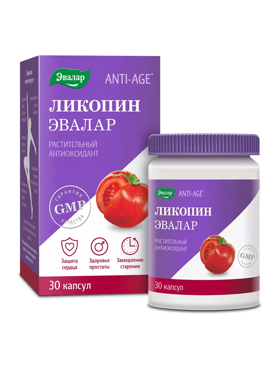 Защита клеток от повреждения свободными радикалами.Ликопин способствует:- замедлению процесса старения и поддержанию молодости кожи- поддержанию здоровья предстательной железы- снижению количества свободных радикалов- поддержанию функционального состояния сердечно-сосудистой системы- поддержанию нормального уровня холестерина- укреплению стенок сосудов и капилляров- поддержанию вязкости крови в норме.Рекомендации по применению: Взрослым по 1 капсуле один раз в день во время еды. Продолжительность приема -не менее 1 месяца Противопоказания: Индивидуальная непереносимость компонентов, беременность, кормление грудью. Перед применением необходимо проконсультироваться с врачом.Состав: масло соевое, оболочка капсулы (пищевые добавки): желатин, глицерин и сорбитовый сироп (агенты влагоудерживающие), ликопин. Содержит подсластитель сорбит, который при чрезмерном употреблении может оказывать слабительное действие.