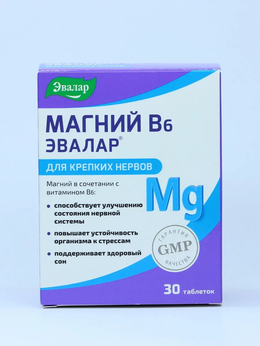 Evalar Magnesium B6 tablets are a product for increasing the body's resistance to stress. Magnesium is a vital micronutrient needed by virtually every cell in the body. Magnesium is essential for energy processes, is responsible for the transmission and speed of nerve impulses from the brain to peripheral nerve endings and muscles, and is involved in reducing neuromuscular tension, maintaining normal neuromuscular excitability, including myocardial contractility. Under stress, the body loses a significant amount of magnesium ions, so supplementing with magnesium protects against the effects of stress. Magnesium supports cellular immunity, regulates metabolism, and promotes the proper distribution of calcium in the body.