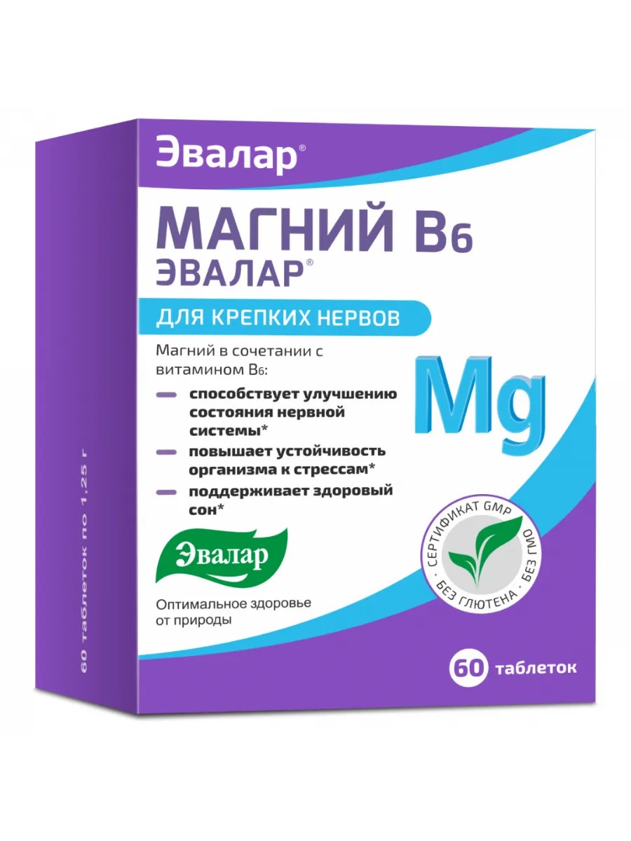 Магний В6 Эвалар - это биологически активная добавка (БАД) к пище, которая содержит магний в составе. Этот минерал является важным элементом для здоровья человека, так как участвует в многих процессах, происходящих в организме. Магний в сочетании с витамином В6 способствуют улучшению состояния нервной системы, повышает устойчивость организма к стрессам, поддерживает здоровый сон. Препарат упакован в таблетки массой 1,25 граммов и поставляется в упаковке из 30 штук. Магний необходим для обеспечения энергетических процессов, отвечает за передачу и скорость прохождения нервного импульса от головного мозга к периферическим нервным окончаниям и мышцам, участвует в процессах ослабления нервно-мышечного напряжения, поддерживая нормальную нервно-мышечную возбудимость, в том числе сократительную способность миокарда. Витамин B6 улучшает усвоение магния и его метаболизм в клетке, обладает способностью фиксировать магний в клетке, что очень важно, поскольку макроэлемент быстро выводится из организма.