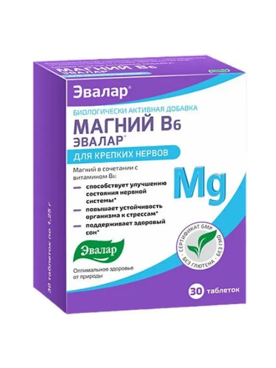 Магний В6 Эвалар - это биологически активная добавка (БАД) к пище, которая содержит магний в составе. Этот минерал является важным элементом для здоровья человека, так как участвует в многих процессах, происходящих в организме. Магний в сочетании с витамином В6 способствуют улучшению состояния нервной системы, повышает устойчивость организма к стрессам, поддерживает здоровый сон. Препарат упакован в таблетки массой 1,25 граммов и поставляется в упаковке из 30 штук. Магний необходим для обеспечения энергетических процессов, отвечает за передачу и скорость прохождения нервного импульса от головного мозга к периферическим нервным окончаниям и мышцам, участвует в процессах ослабления нервно-мышечного напряжения, поддерживая нормальную нервно-мышечную возбудимость, в том числе сократительную способность миокарда. Витамин B6 улучшает усвоение магния и его метаболизм в клетке, обладает способностью фиксировать магний в клетке, что очень важно, поскольку макроэлемент быстро выводится из организма.