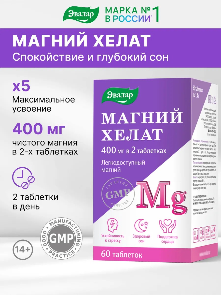 Для максимального усвоения магния попробуйте легко усваиваемый хелатный комплекс Магний хелат Эвалар.
