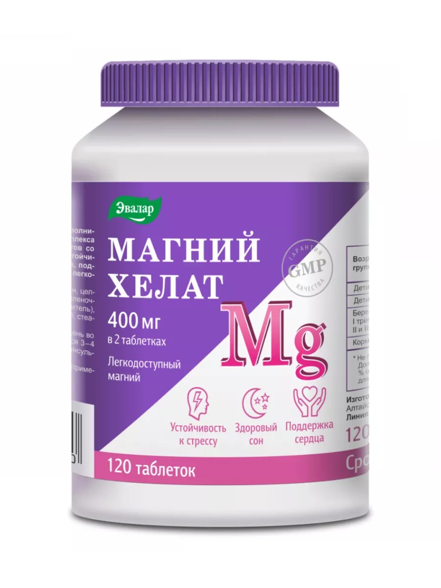 Магний Xелат Эвалар - это биологически активная добавка к пище, содержит магний в самой биодоступной форме – бисглицинат магния – для максимального усвоения и эффективности. Магний Xелат Эвалар поддерживает здоровую работу нервной системы, мышц и сердца, способствует снятию мышечных спазмов и судорог, нормализации сна и повышению устойчивости организма к стрессу. Максимально восполняет дефицит магния и комфортно переносится без побочных эффектов со стороны ЖКТ. Легко принимать: всего 2 таблетки в день. Перед применением рекомендуется проконсультироваться с врачом.