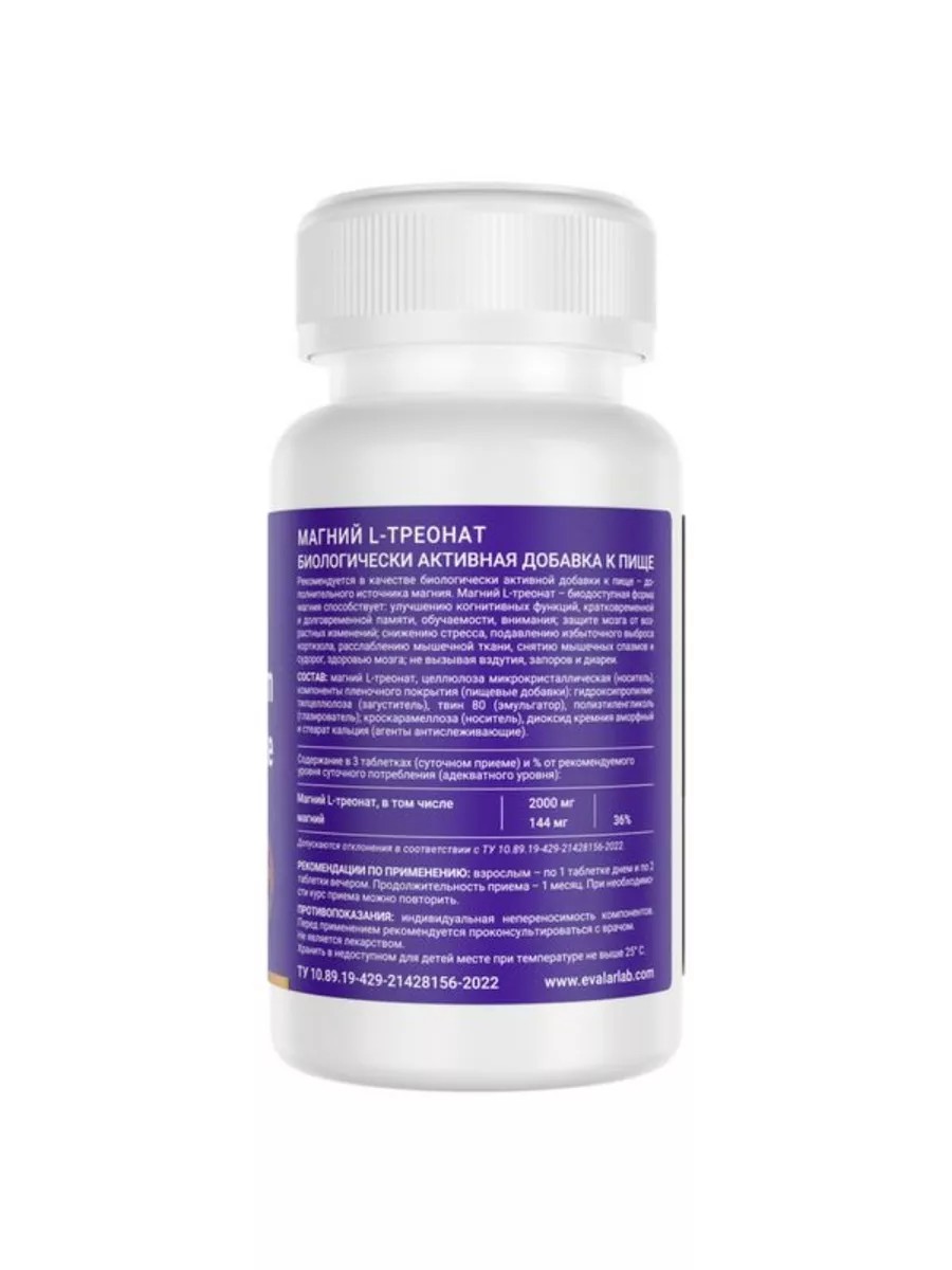 Магний L-треонат от Evalar Laboratory - это магний, который был разработан на основе новейших научных исследований, чтобы обеспечить максимальную пользу для здоровья мозга и поддержания когнитивных функций. Согласно исследованием магний L-треонат уменьшает когнитивный возраст мозга на 9,4 года.Evalar Laboratory выпускает Магний L-треонат в виде соединения, полученного путем смешивания магния с треоновой кислотой (водорастворимое вещество, образующееся при метаболическом распаде витамина С), именно поэтому Магний L-треонат от Evalar Laboratory легко всасывается.В связи с тем, что магний L-треонат проходит через гематоэнцефалический барьер, и в основном усваивается мозгом, он не оказывает слабительного действия, в отличие от других форм магния.Способ примененияВзрослым по 1 таблетке днем и по 2 таблетки вечером.Продолжительность приема -1 месяц. При необходимости прием можно повторить.Составмагний L-треонат, целлюлоза микрокристаллическая (носитель), компоненты пленочного покрытия: гидроксипропилметилцеллюлоза (загуститель), полиэтиленгликоль (глазирователь), твин 80 (эмульгатор); кроскарамеллоза (носитель), диоксид кремния аморфный и стеарат кальция (агенты антислеживающие).