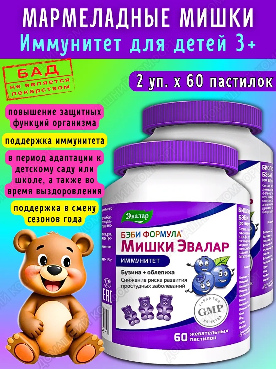 БАД для детей с 3 лет для иммунитета, витамины с бузиной, витамин С, D3, Е, цинк, вкусные пастилки, Бэби формула мишки Эвалар — забота о детском здоровье в сезон простуд и в период адаптации.