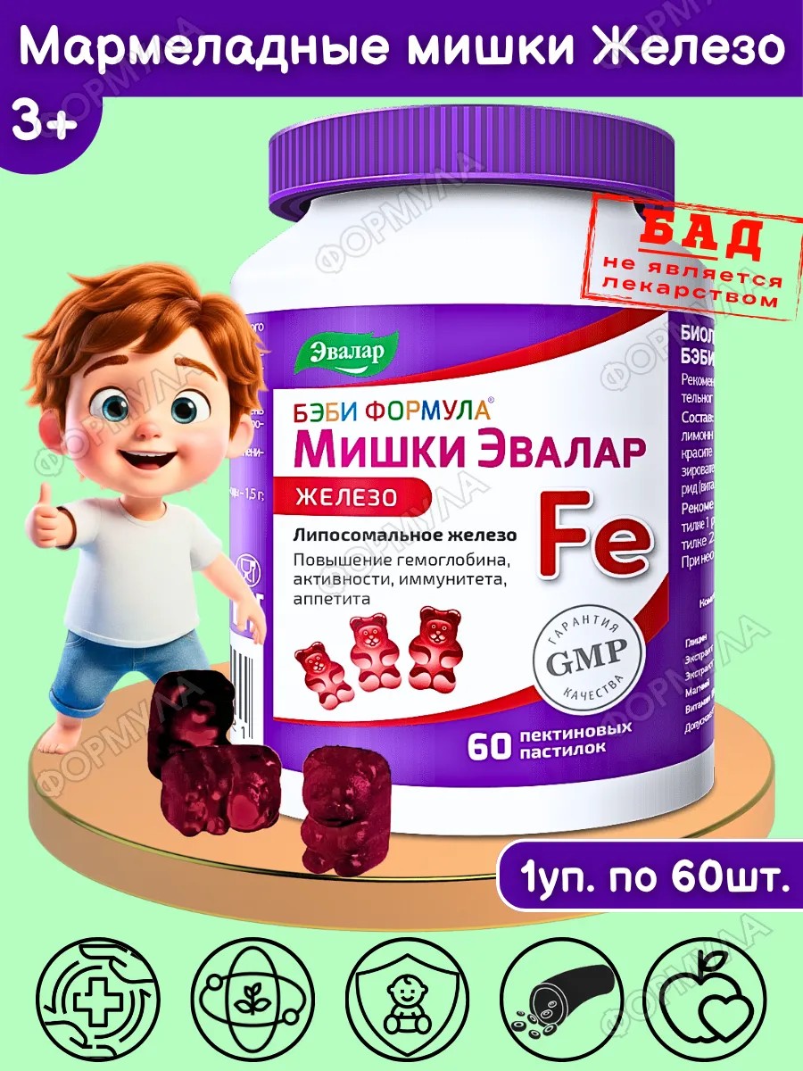 Бэби формула мармеладные мишки железо — это биологически активная добавка (БАД) для детей от 3 лет, разработанная специально для поддержания нормального уровня гемоглобина и профилактики железодефицитной анемии. Вкусные жевательные витамины с легкоусвояемым липосомальным железом обеспечивают высокую биодоступность и хорошую переносимость, что особенно важно для растущего организма.