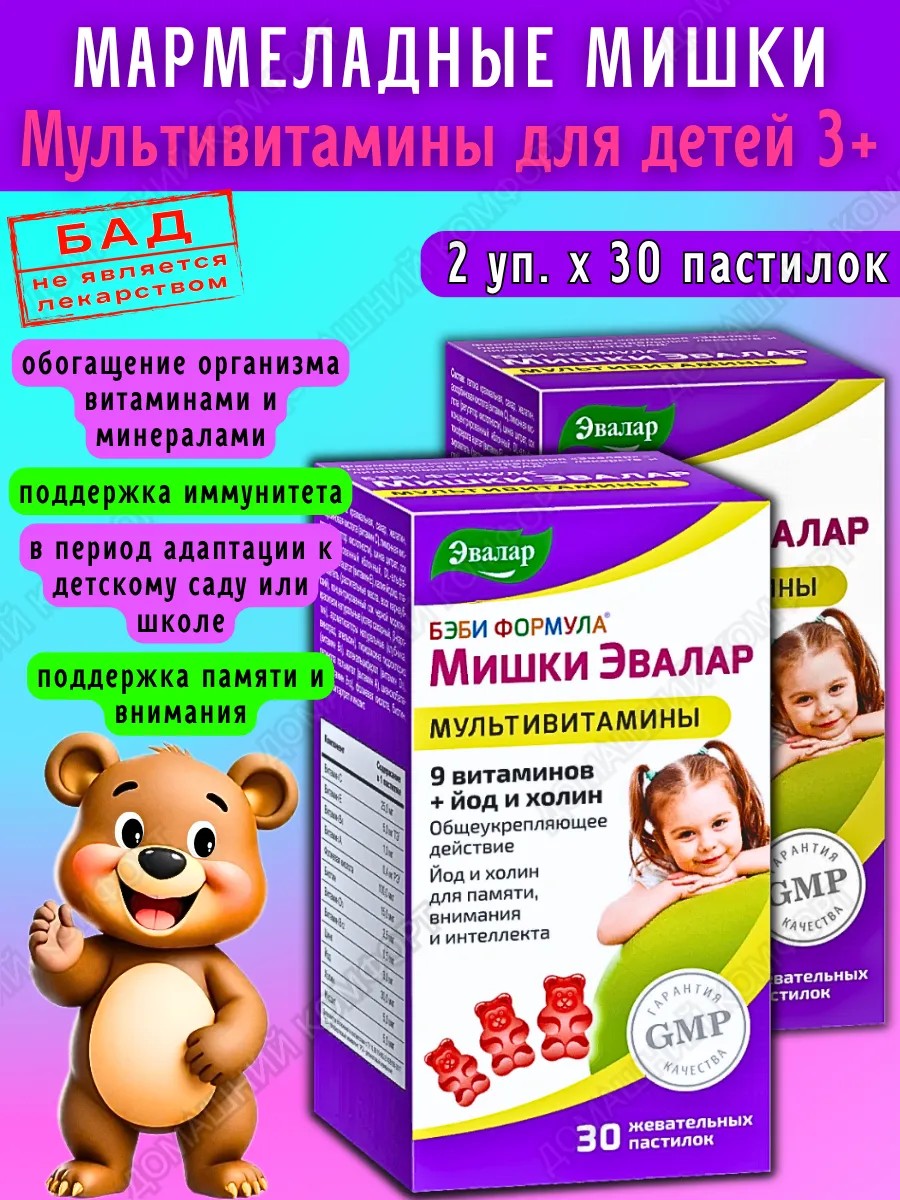 Эвалар Мармеладные мишки Мультивитамины для детей 3+ 30шт*2уп